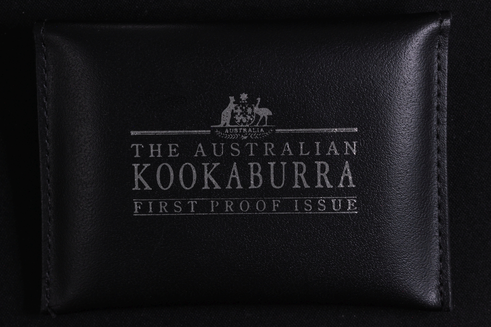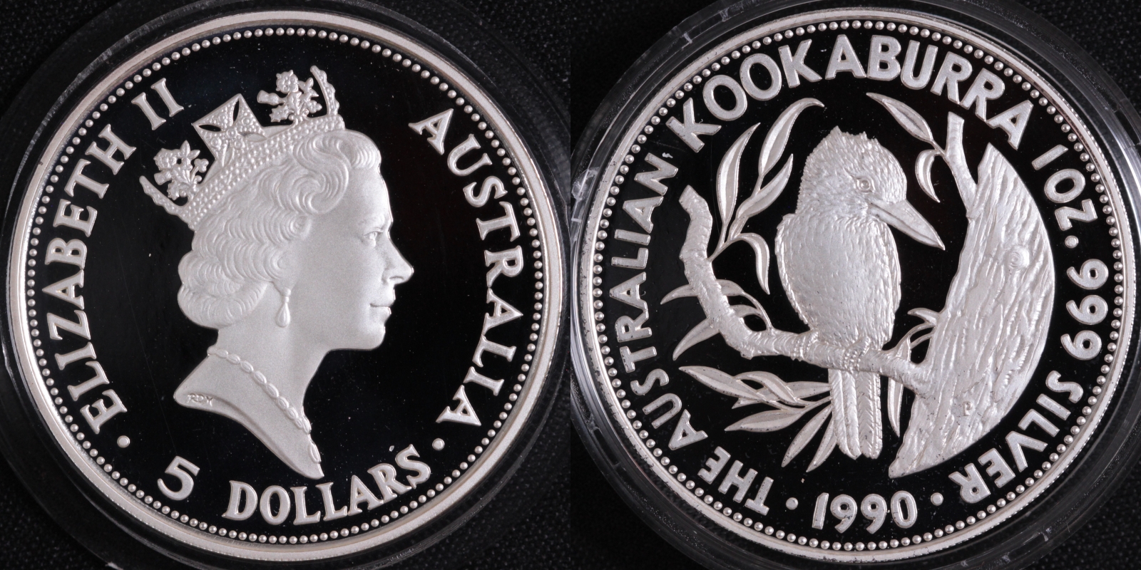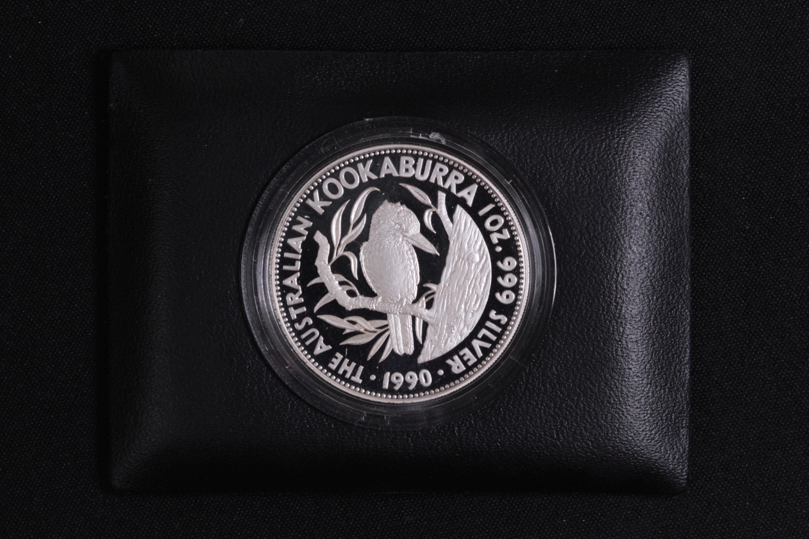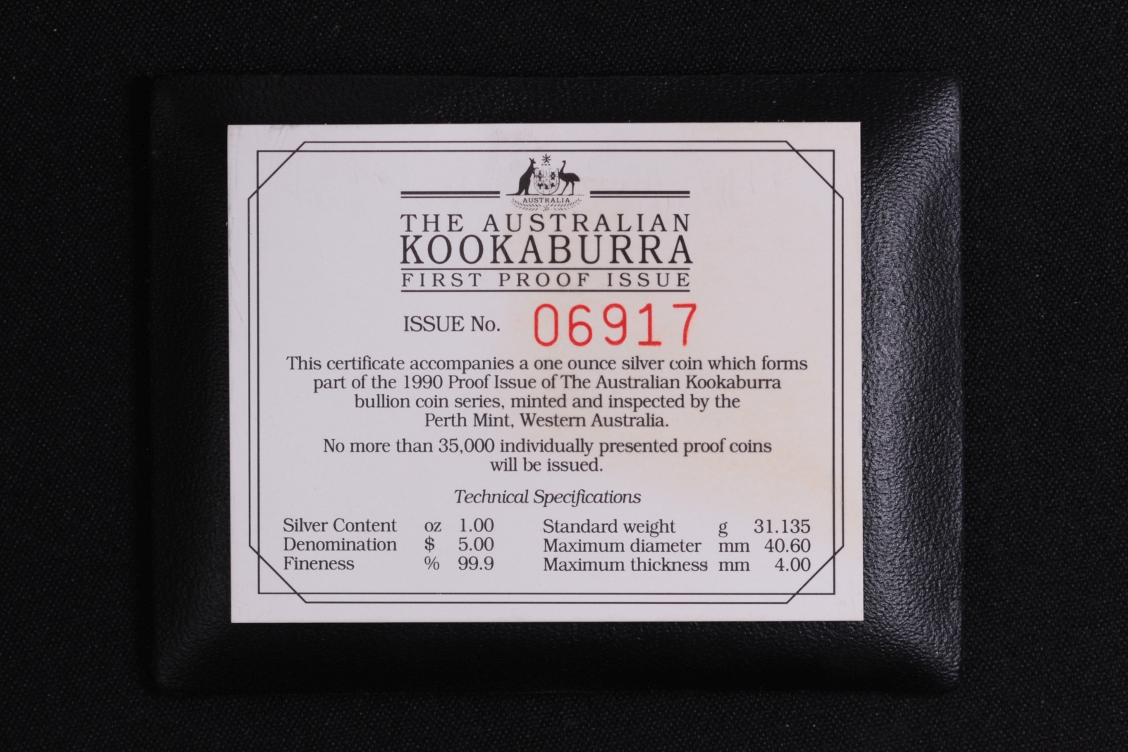 1990 Australian Kookaburra $5 First Proof Issue 1oz Silver Coin. Coin in capsule with Perth Mint wallet and certificate, issue no. 06917.