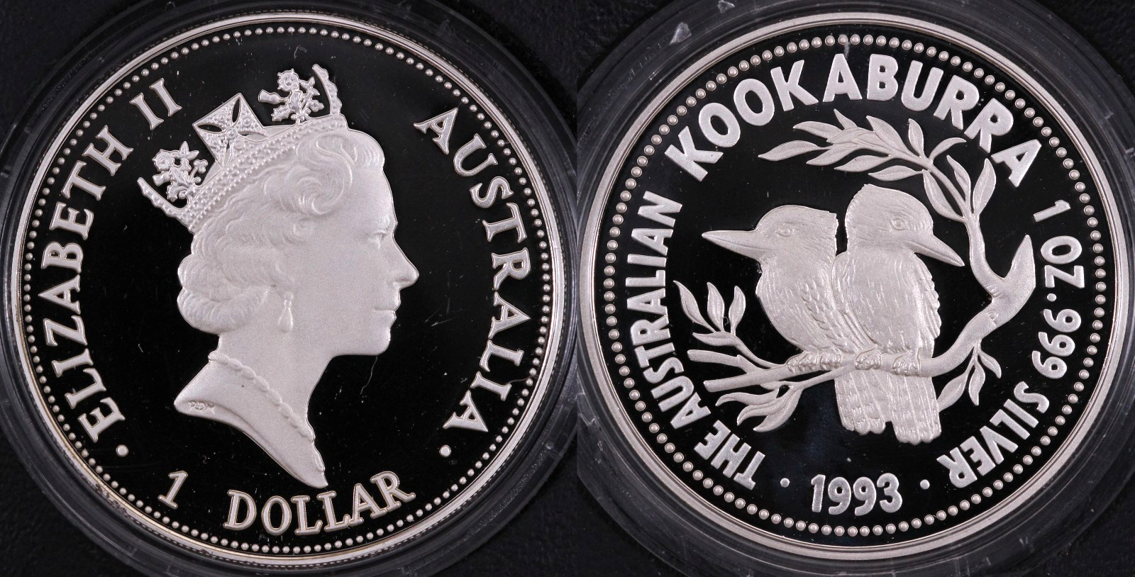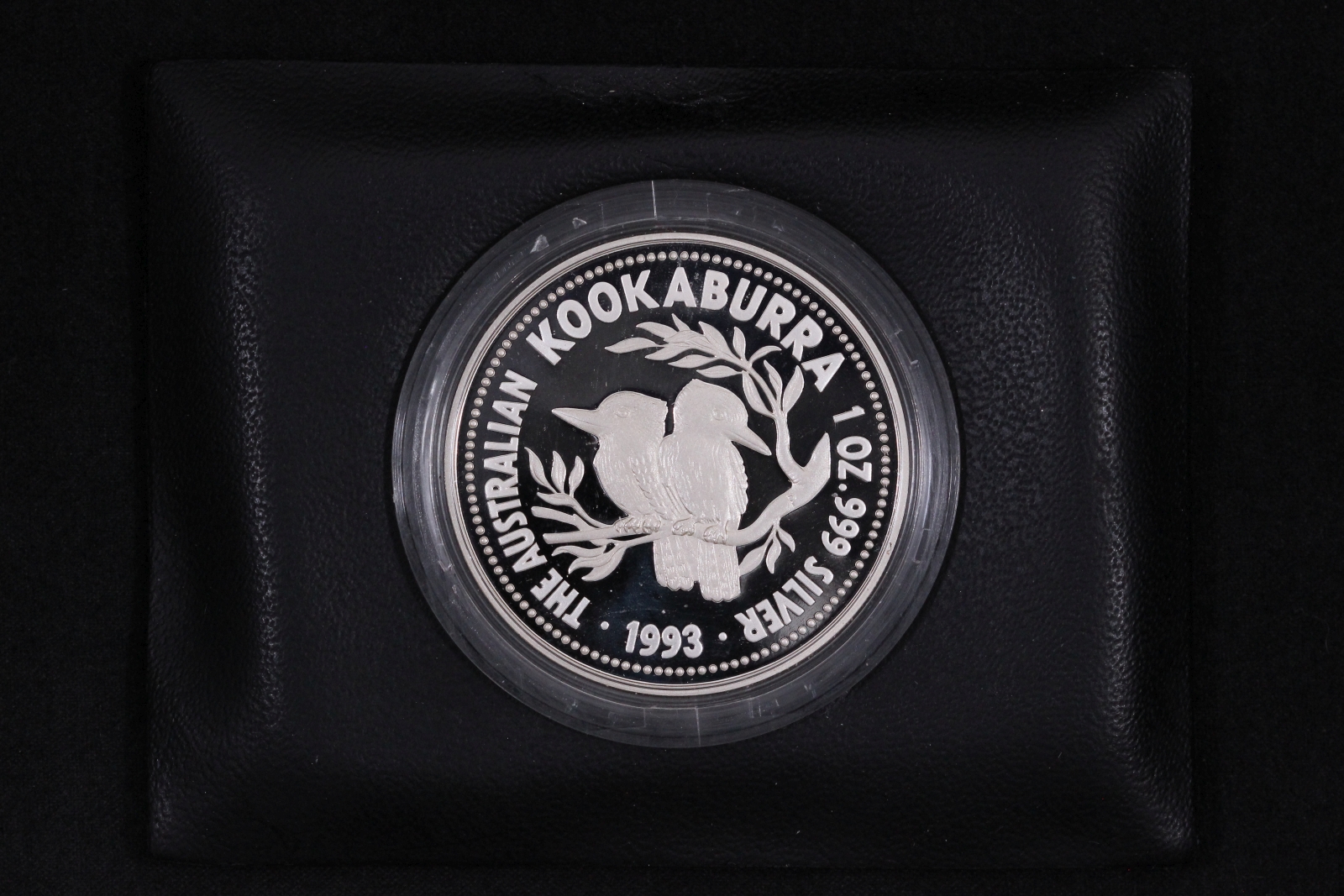 1993 Australian Kookaburra $1 Proof Issue 1oz silver coin. Coin in capsule with Perth Mint wallet and certificate, issue no. 05263.
