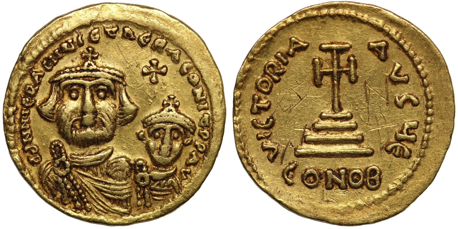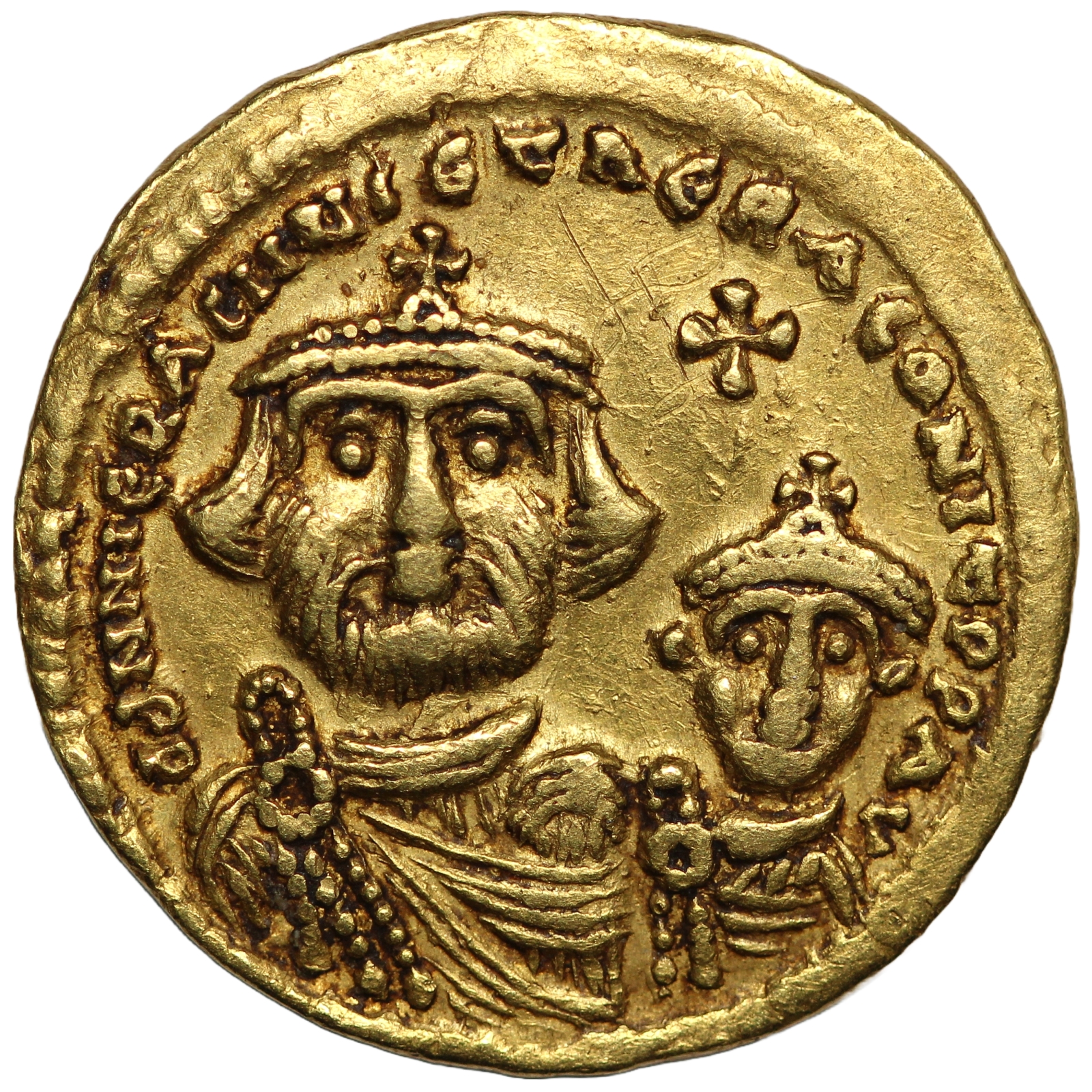 Obv: δδ NN ҺЄRACLIЧS ЄT ҺЄRA CONST P P AV. Facing busts of Heraclius with short beard and tufts of hair at ears on left and Heraclius Constantine beardless on right, both wearing chlamys and simple crown with cross on circlet; cross between their heads.
