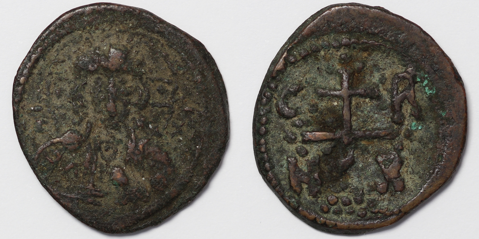 Facing bust of Christ Pantokrator; IC XC across fields / Jewelled patriarchal cross with central X set on base; C B/ N B in quarters.