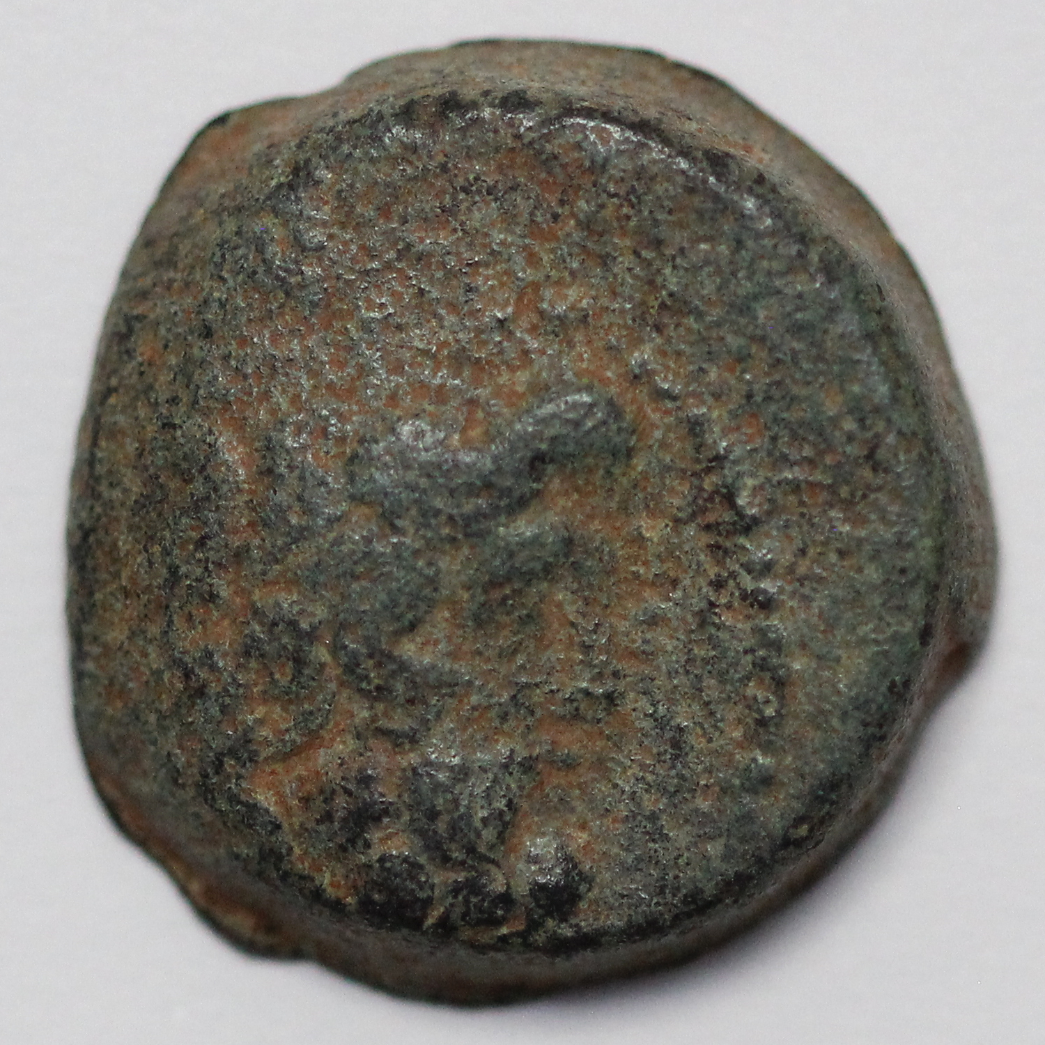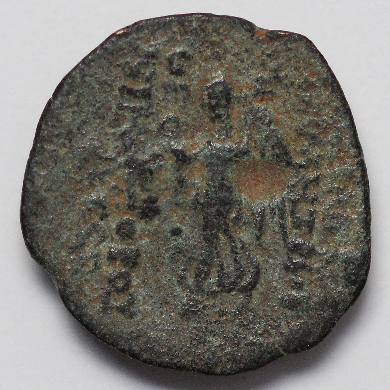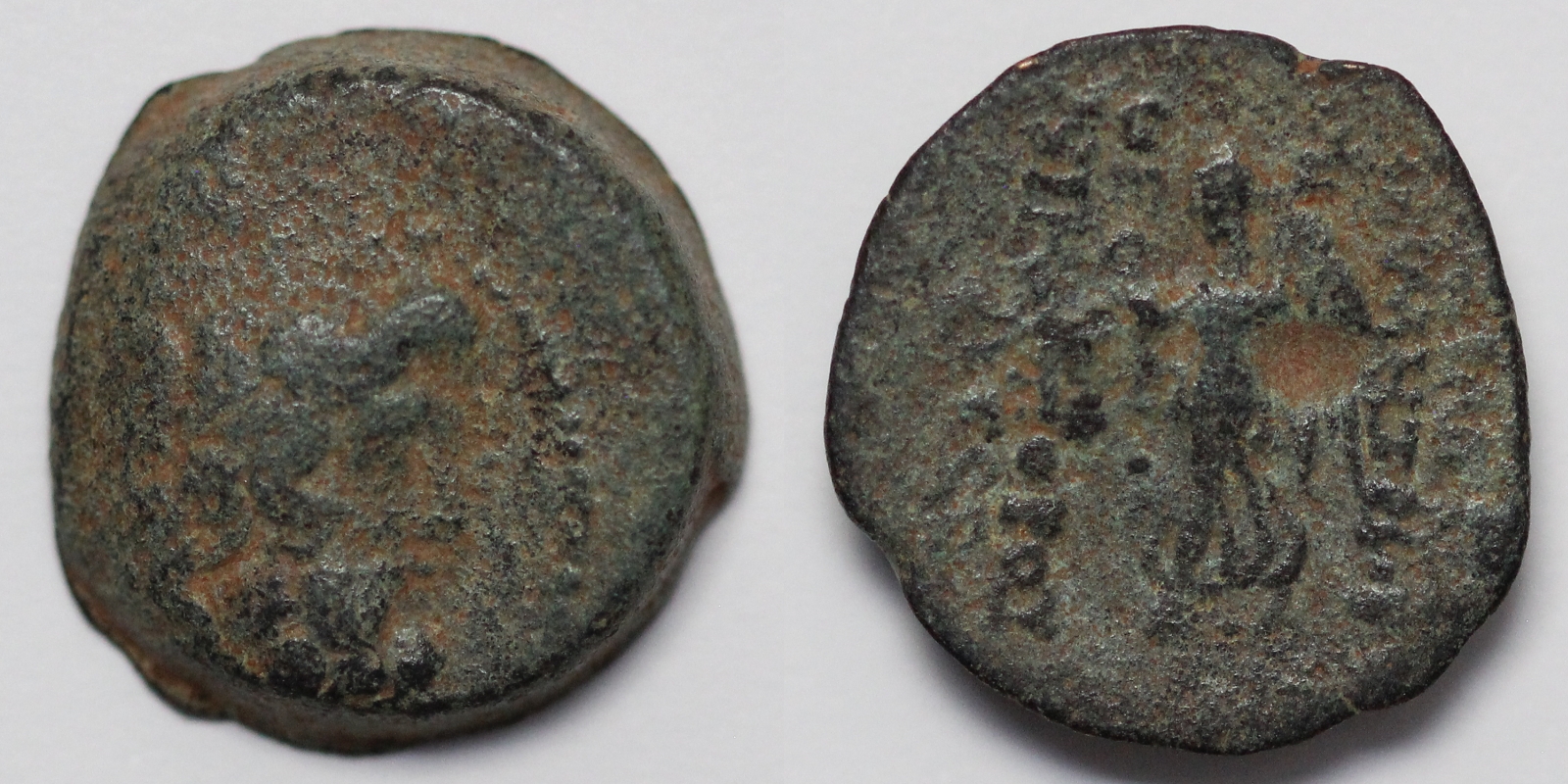 Laureate head of Zeus right / [ΒΑΣΙΛΕΩΣ] ΔΗΜΗΤ[ΡΙΟΥ] ΘΕΟΥ ΝΙΚΑΤ[ΟΡΟΣ]; Nike advancing left, holding wreath and palm frond.
