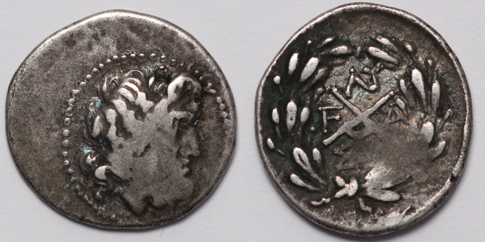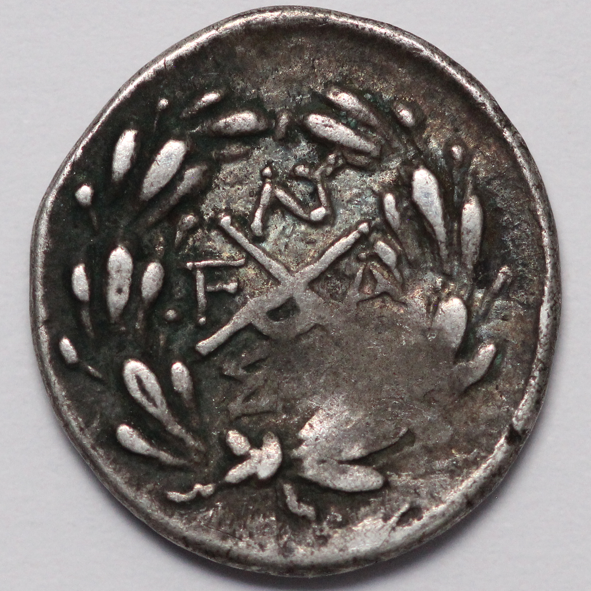 Laureate head of Zeus to right. / AX monogram between F and A, above, ΛΥ, below, ΣΩ; all within laurel wreath.