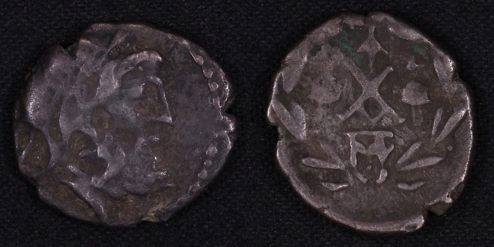 Achaean League, Lakedaimon (Sparta), Triobol, c. 90-50 BC, laureate head of Zeus right, rev. monogram above and below, two pilei to sides, 2.08g (BCD 865.3; McClean 6590; cf. BMC 85-6).