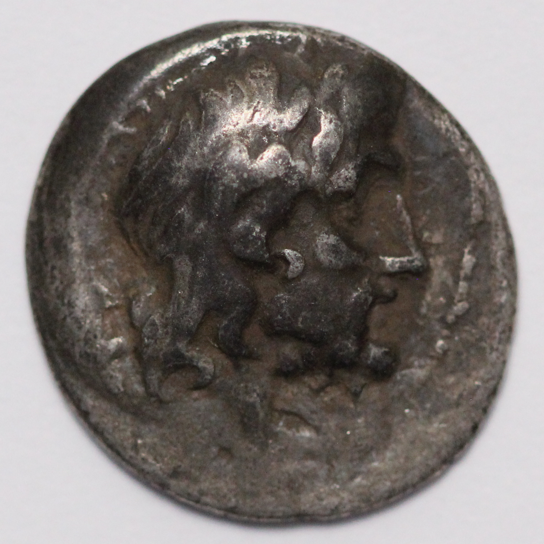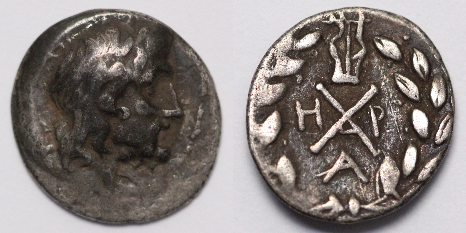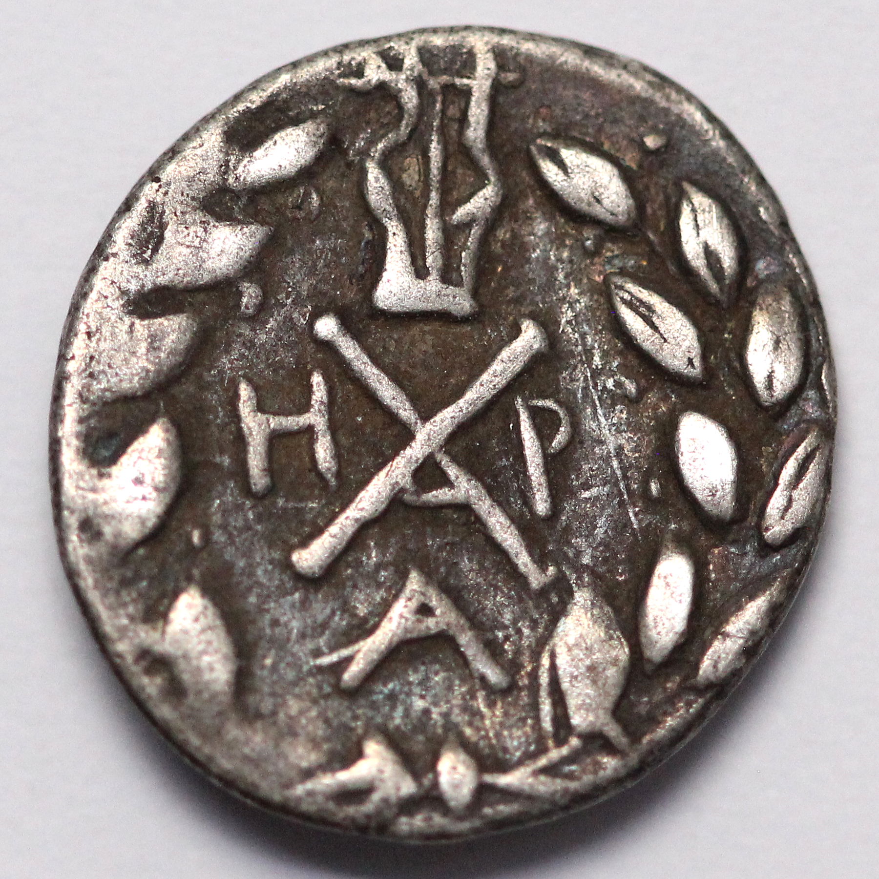 Laureate head of Zeus to right. / AX monogram between H and P, above, kithara, below, A; all within laurel wreath.
