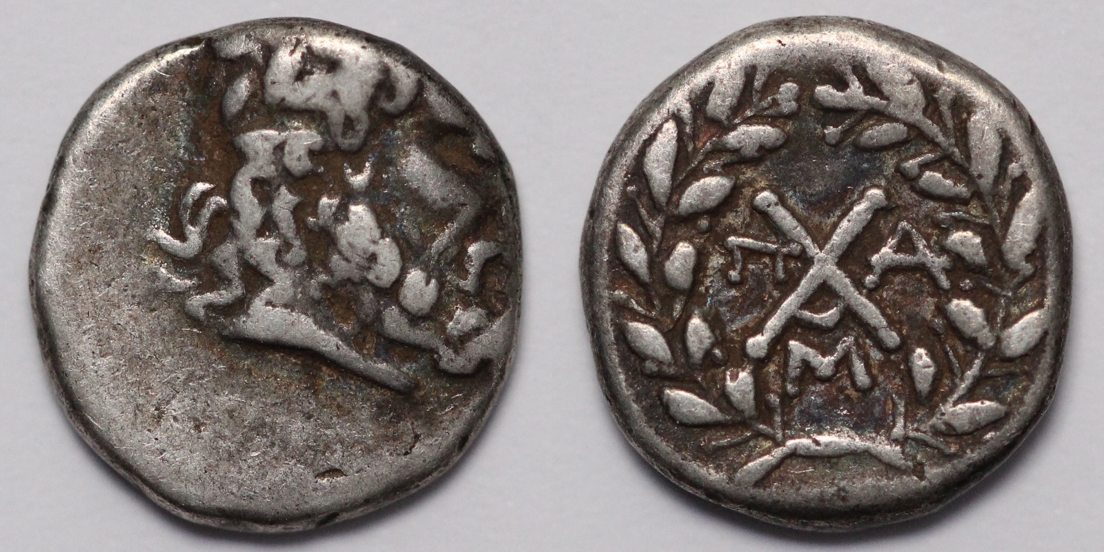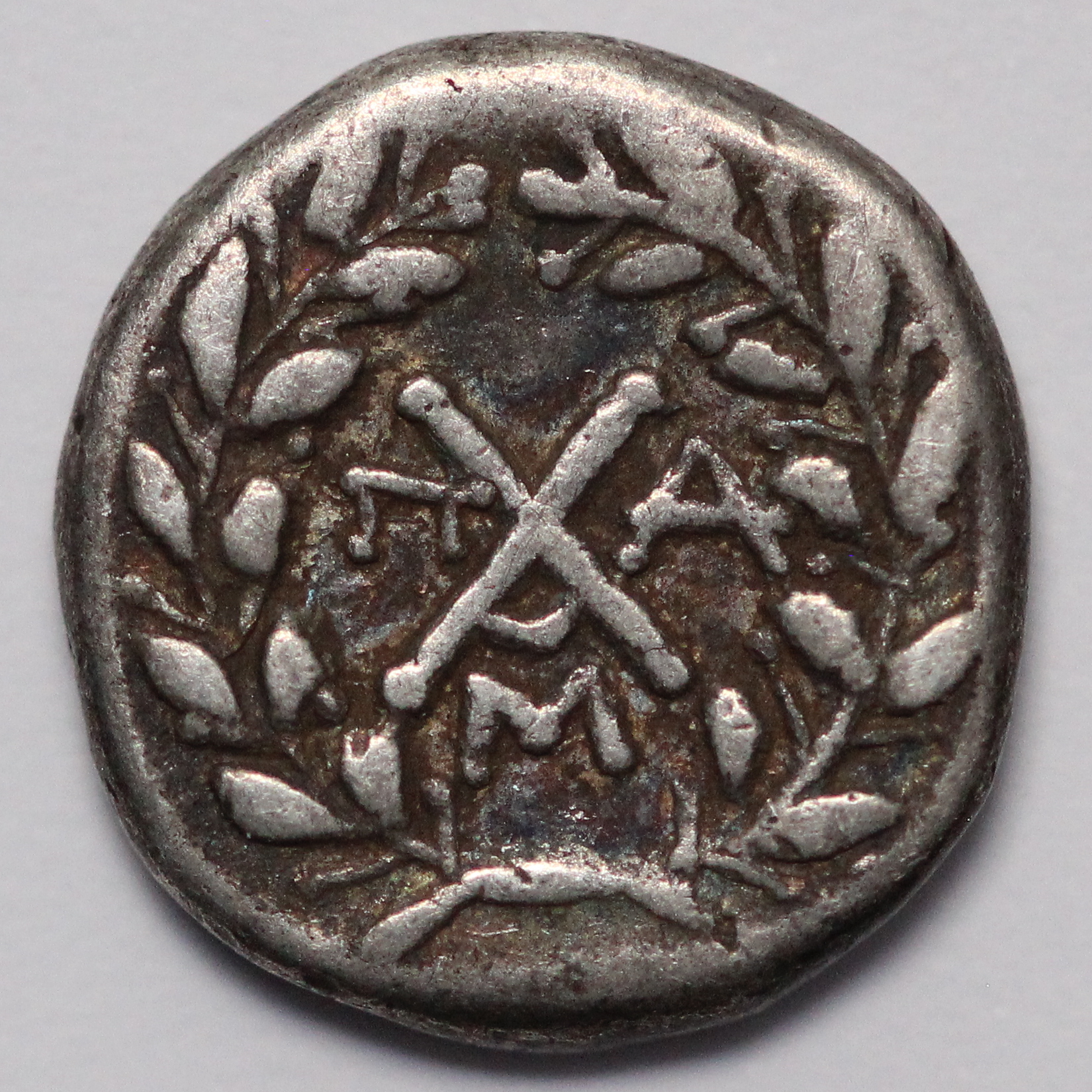 Laureate head of Zeus to right. / AX monogram between Π and A, below, M; all within laurel wreath.