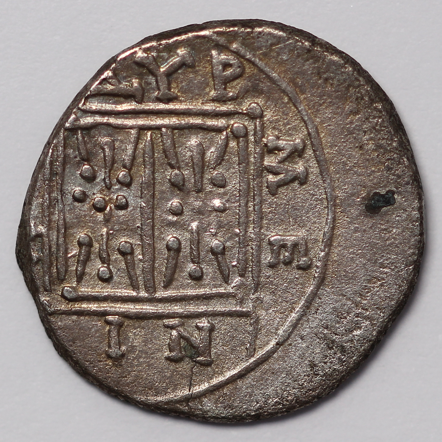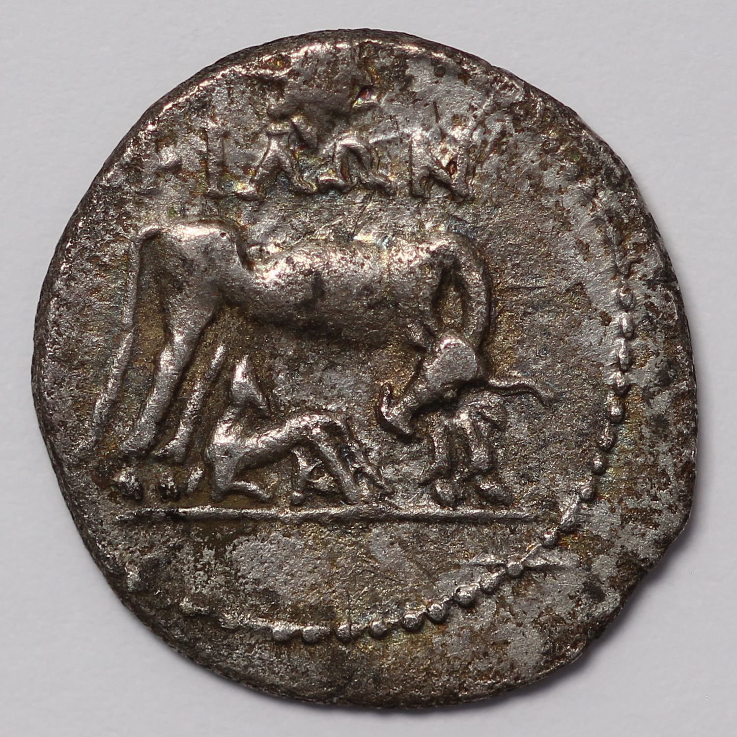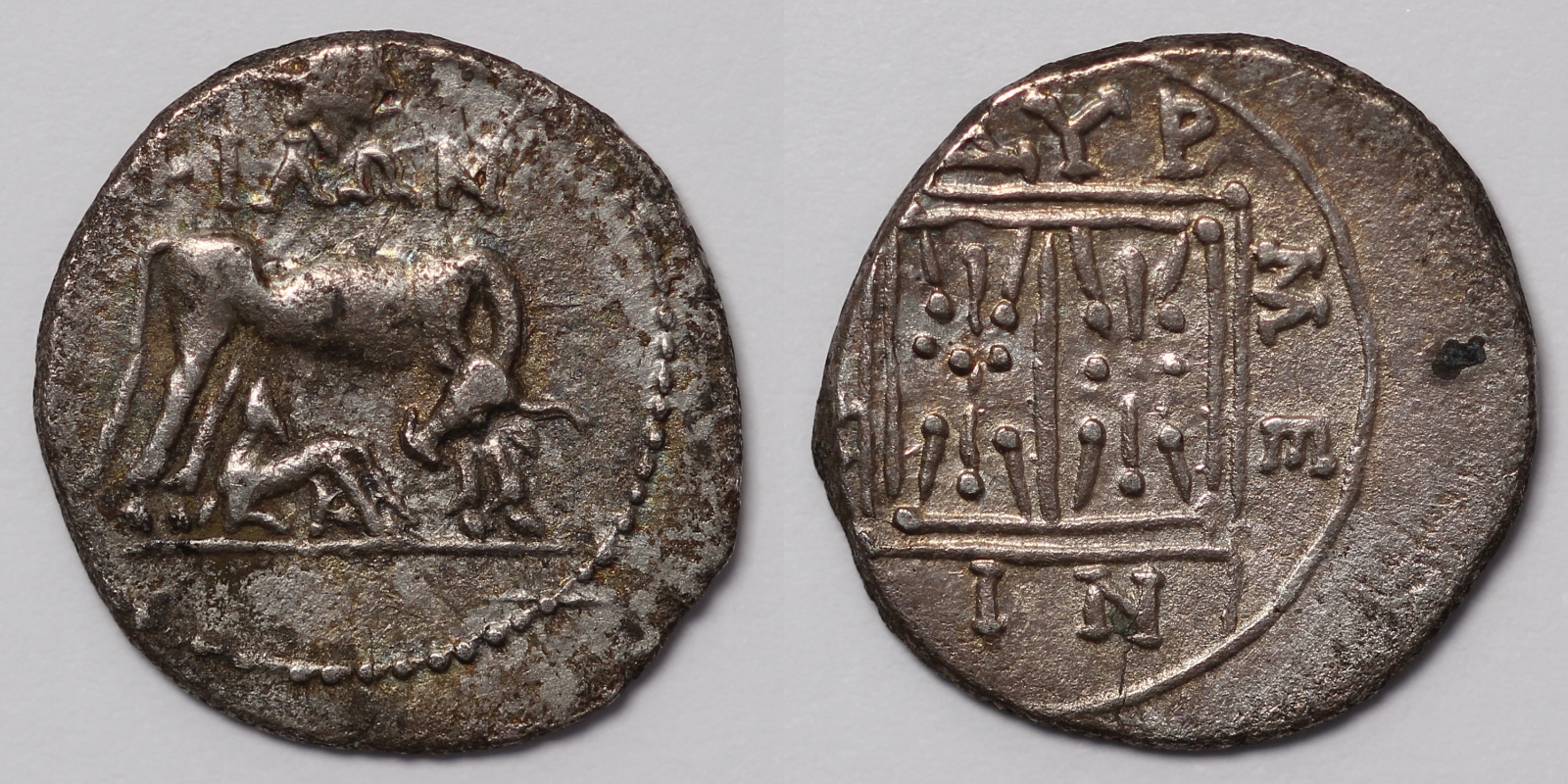 ΦIΛΩN, cow standing right, suckling calf standing left below; head of Helios right above / ΔYP-ME-NI-ΣKOY, double stellate pattern.