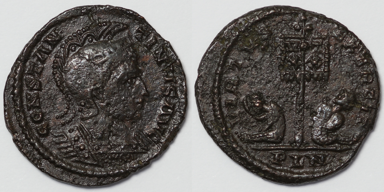 CONSTAN-TINVS AVG, helmeted and cuirassed bust right / VIRTVS-EXERCIT, Standard inscribed VOT/XX in two lines standing on ground, captives bound on ground on either side ; PLN in exergue.