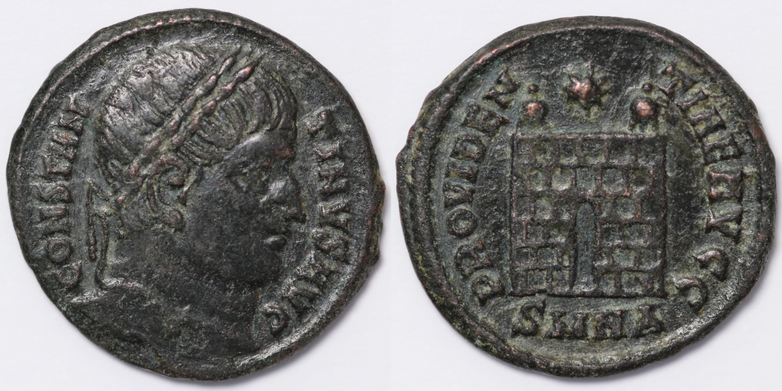 Obv: CONSTAN-TINVS AVG; Head of Constantine I, laureate, right.