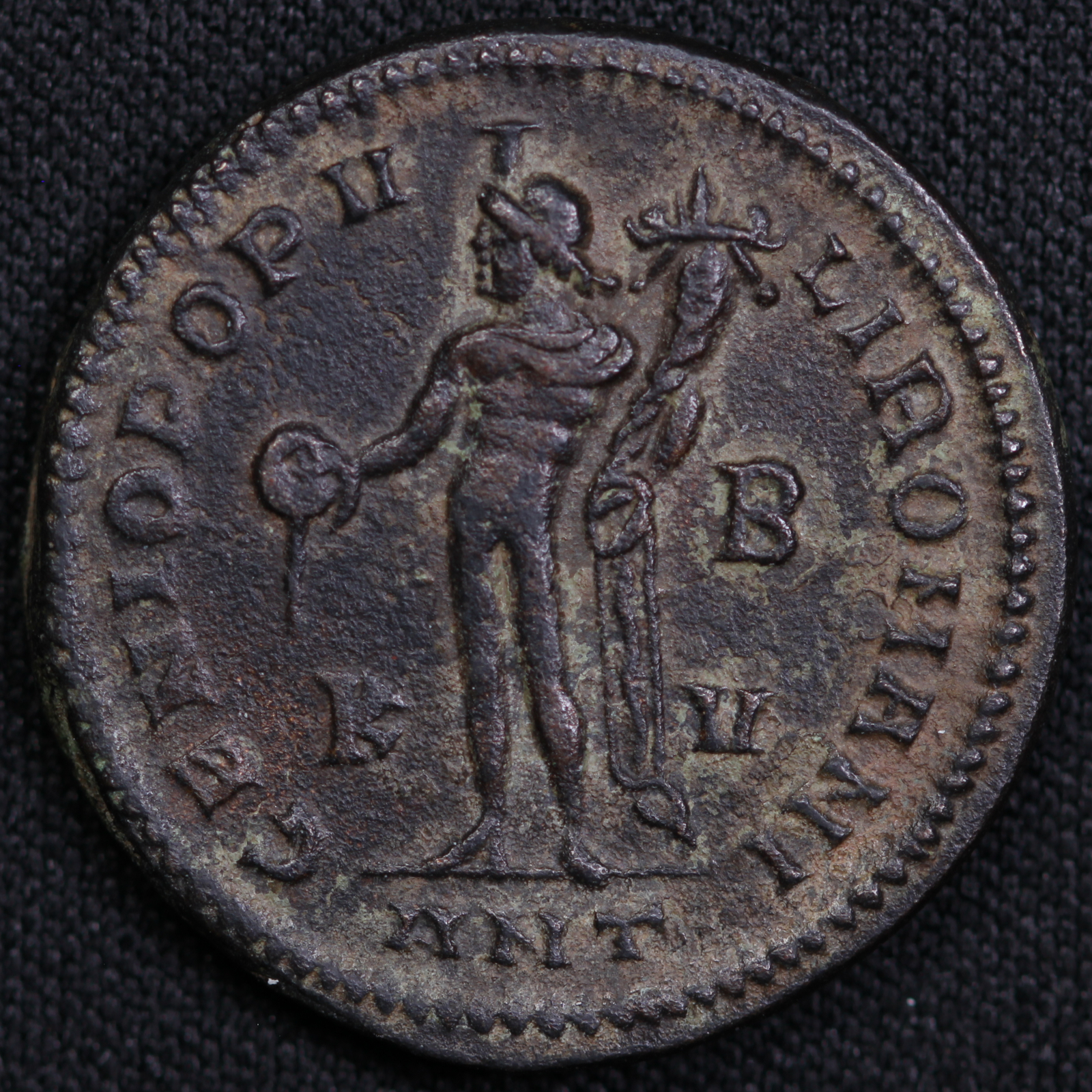 Rev: GENIO POPV-LI ROMANI, K to left, B above V to right, ANT in exergue, Genius, nude but for chlamys over his left shoulder, standing front, head to left, holding patera, from which liquor flows, in his right hand and a cornucopia with his left.