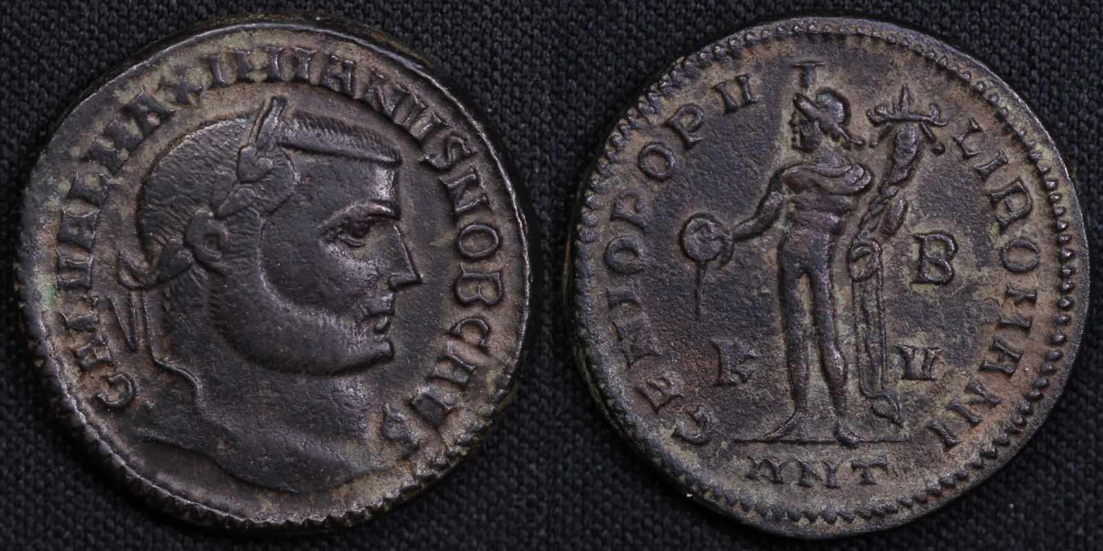 Obv: GAL VAL MAXIMIANVS NOB CAES, Laureate head right.