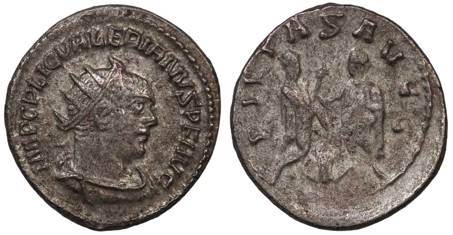 Valerian I. AD 253-260. AR Antoninianus (3.48g). Samosata mint. 1st emission, AD 255-256. Radiate, draped, and cuirassed bust right / The two emperors standing facing one another, sacrificing over altar, that on the left holding eagle–tipped scepter, that on the right holding parazonium. RIC V 285; MIR 36, 1676e; RSC 152