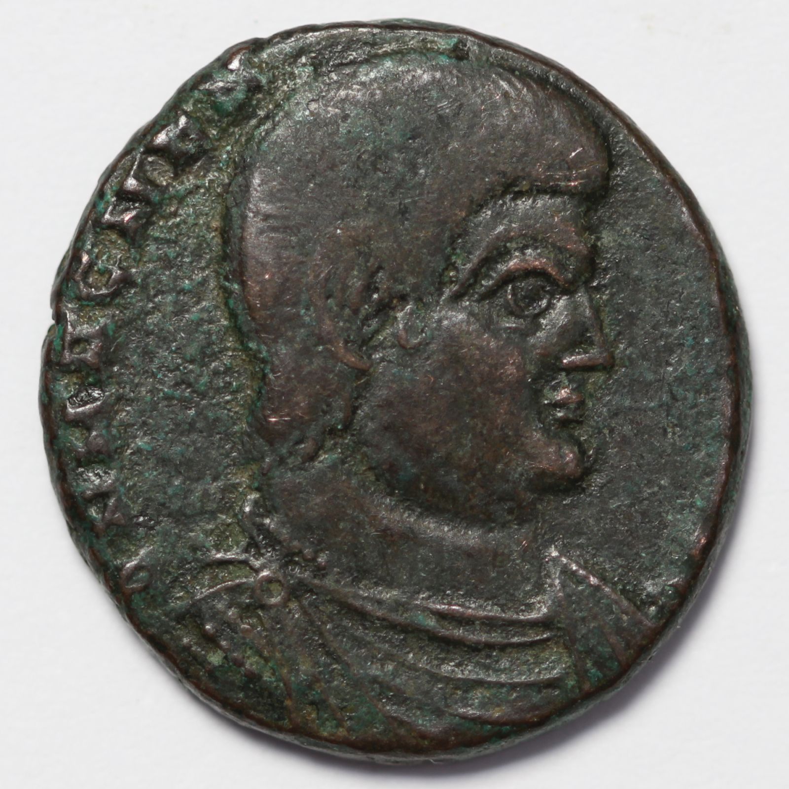 Obv: D N MAGNEN-TIVS P F AVG; Bust of Magnentius, bareheaded, draped, cuirassed, right.