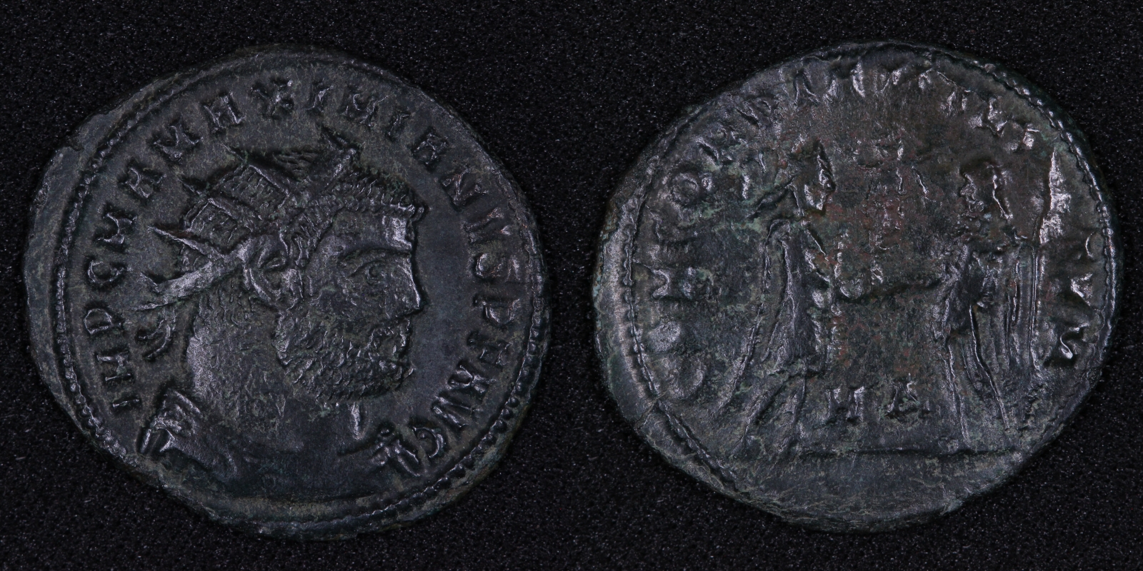 Obv: IMP C M A MAXIMIANVS P F AVG; Radiate and cuirassed bust r.
