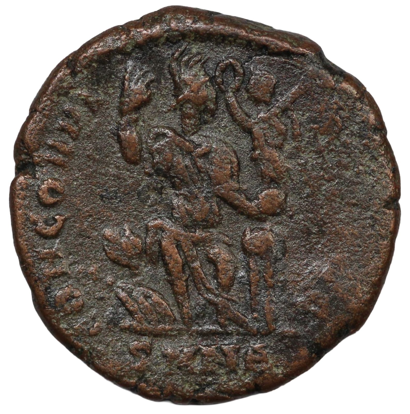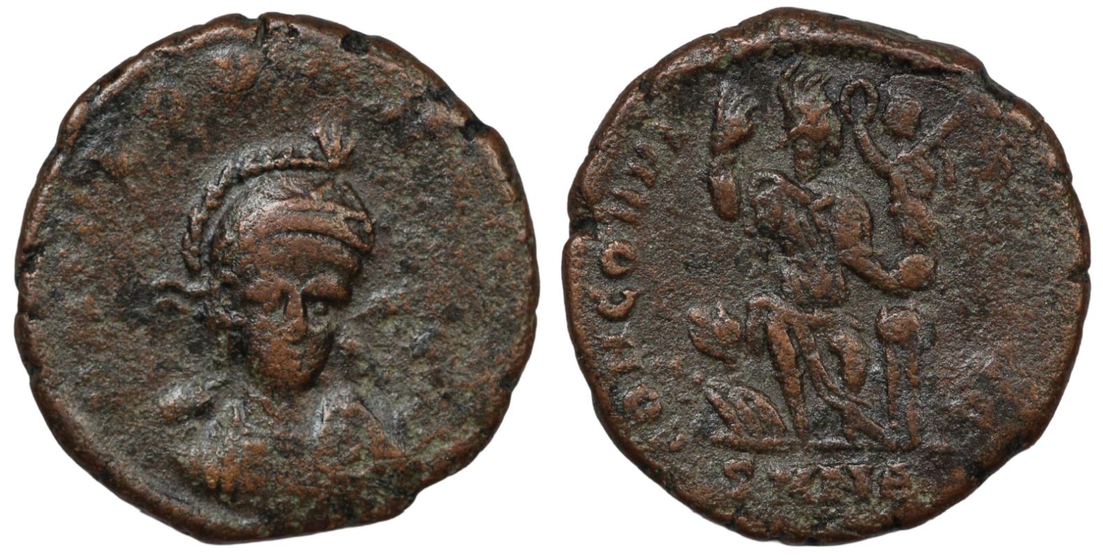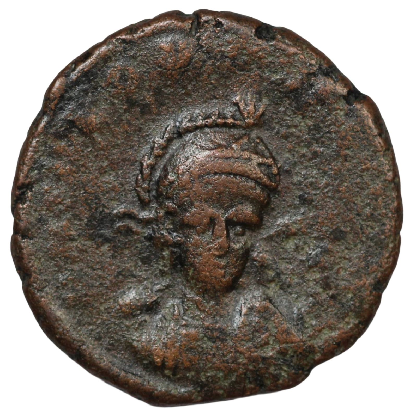 THEODOSIUS II, 408-450 AD. Æ Follis (2.79gm) of Nikomedia, 401-3. Armoured facing bust with spear and shield / Constantinopolis enthroned. RIC.93(S).