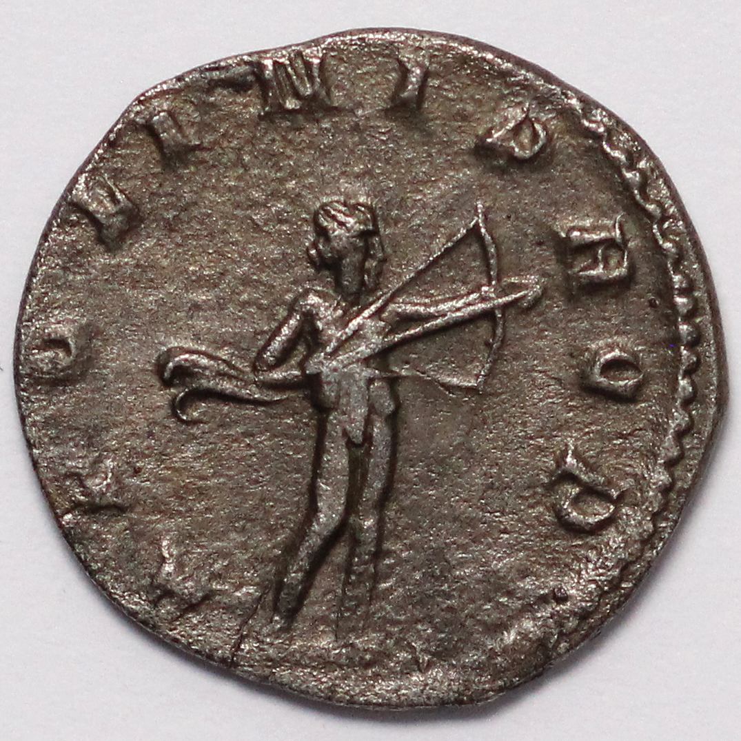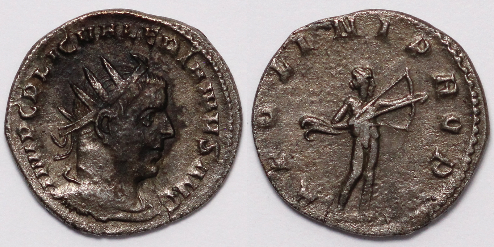 IMP C P LIC VALERIANVS AVG, Radiate, draped, and cuirassed bust right / APOLINI PROP[VG], Apollo standing right, drawing bow.