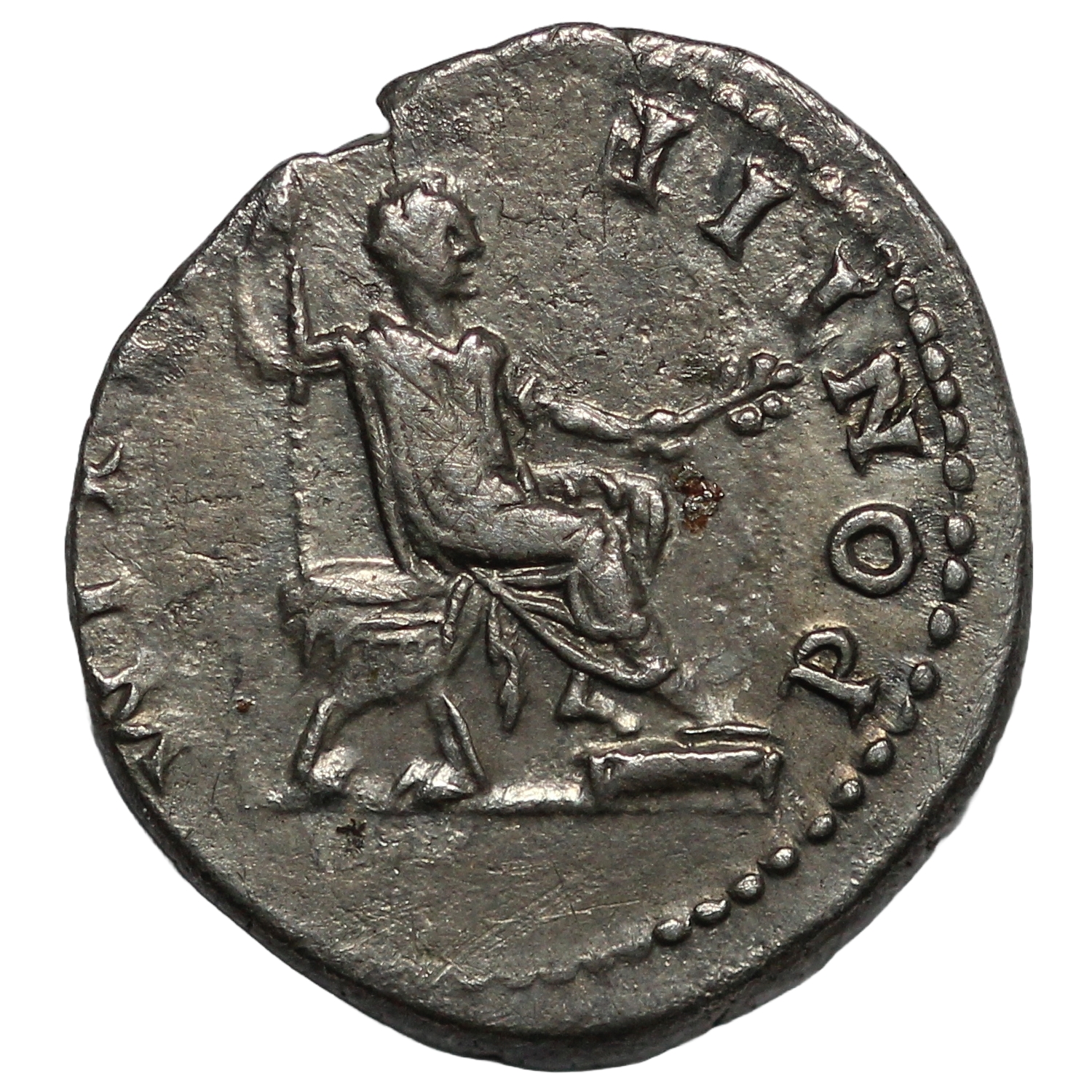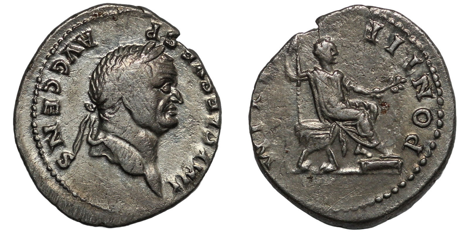 IMP CAES VESP AVG CENS. Laureate head to right. / PONTIF MAXIM. Vespasian, togate, seated right on curule chair, feet on stool, holding vertical sceptre in right hand and branch in left.