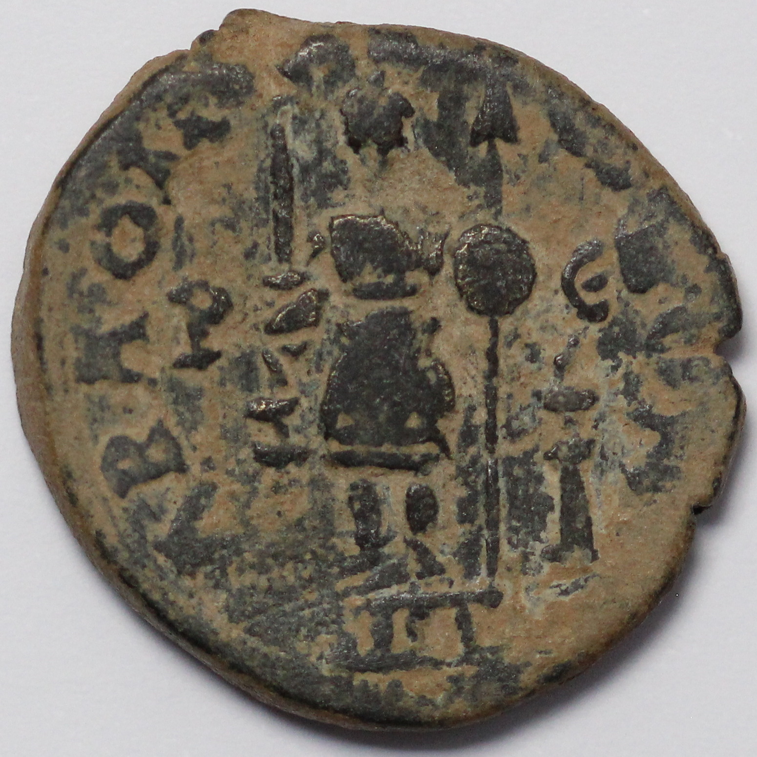 Laureate, draped, and cuirassed bust right, seen from behind / Facing cult statue of Mars, holding sword, spear, and shield; lit altar to either side; P Є (date) across field.
