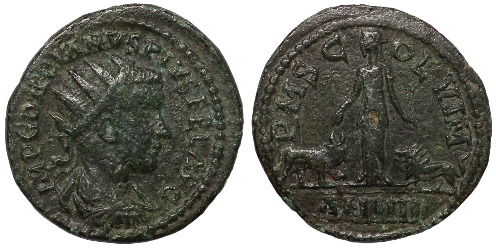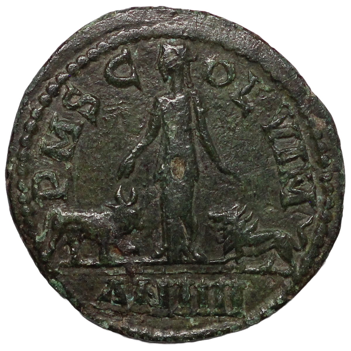 Rev: P M S COL VIM, AN IIII, Moesia standing l.; at l., bull standing r.; at r., lion standing l.