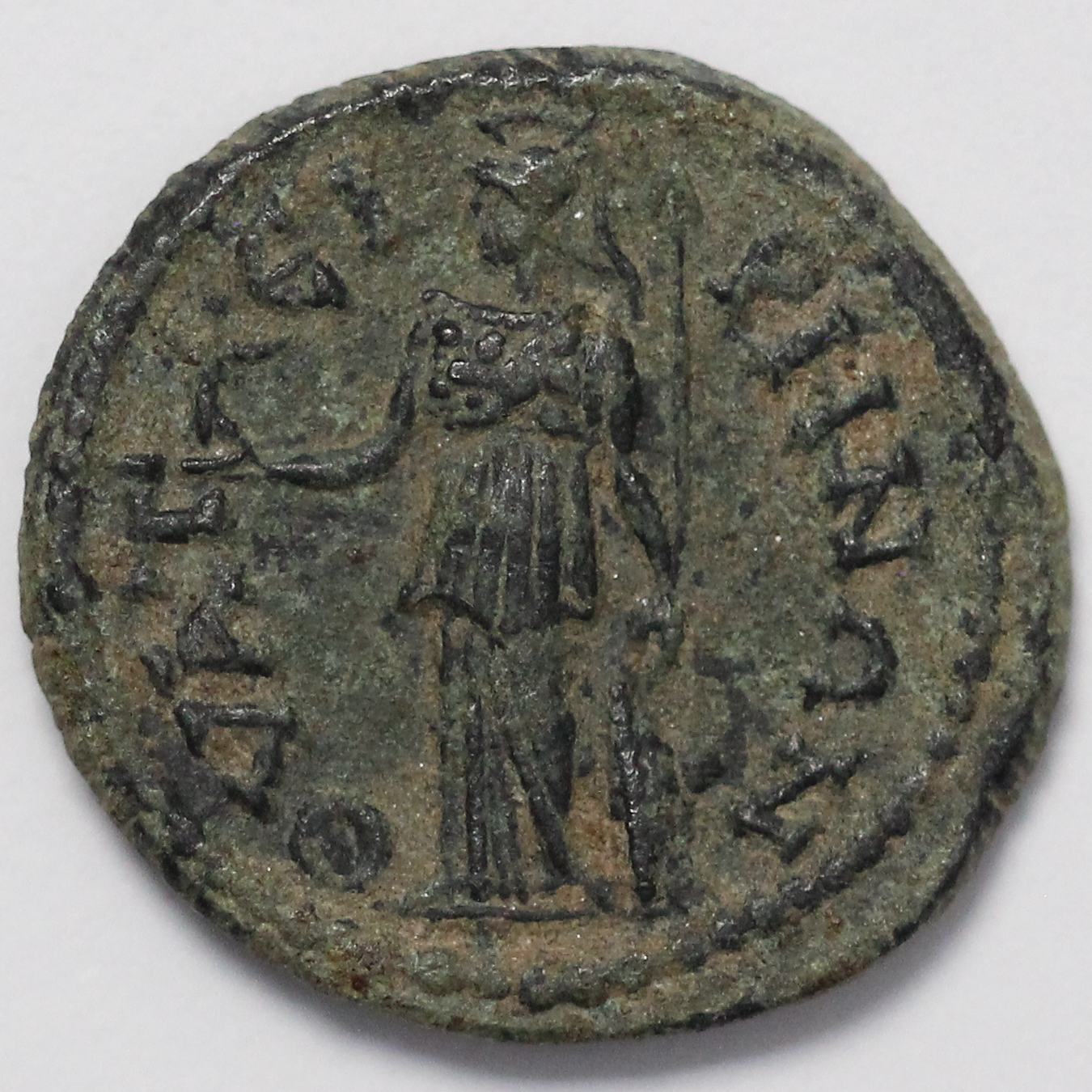 Rev: ΘVΑTЄIPHNΩN; Athena standing left, holding Nike, shield, and spear.
