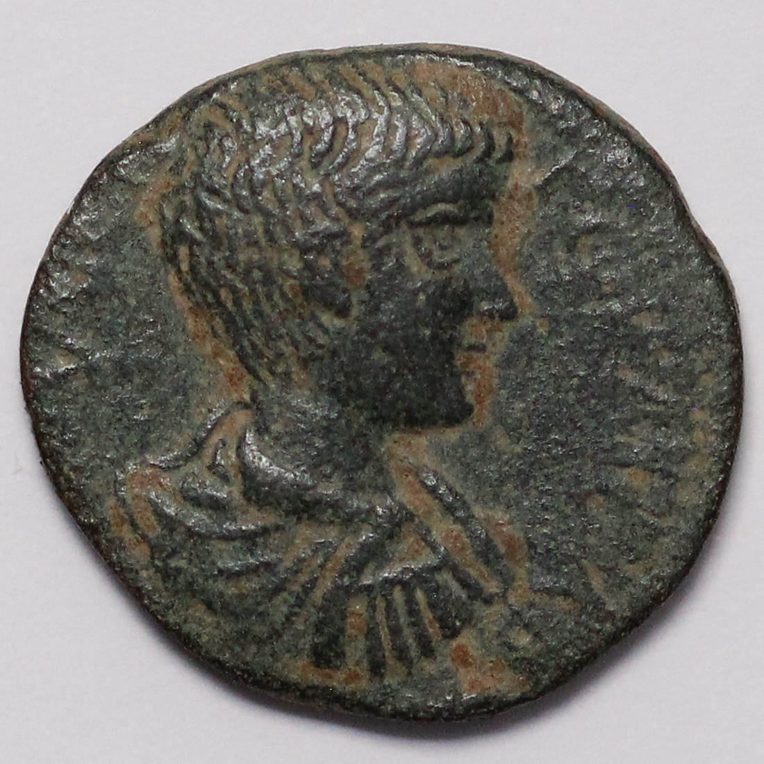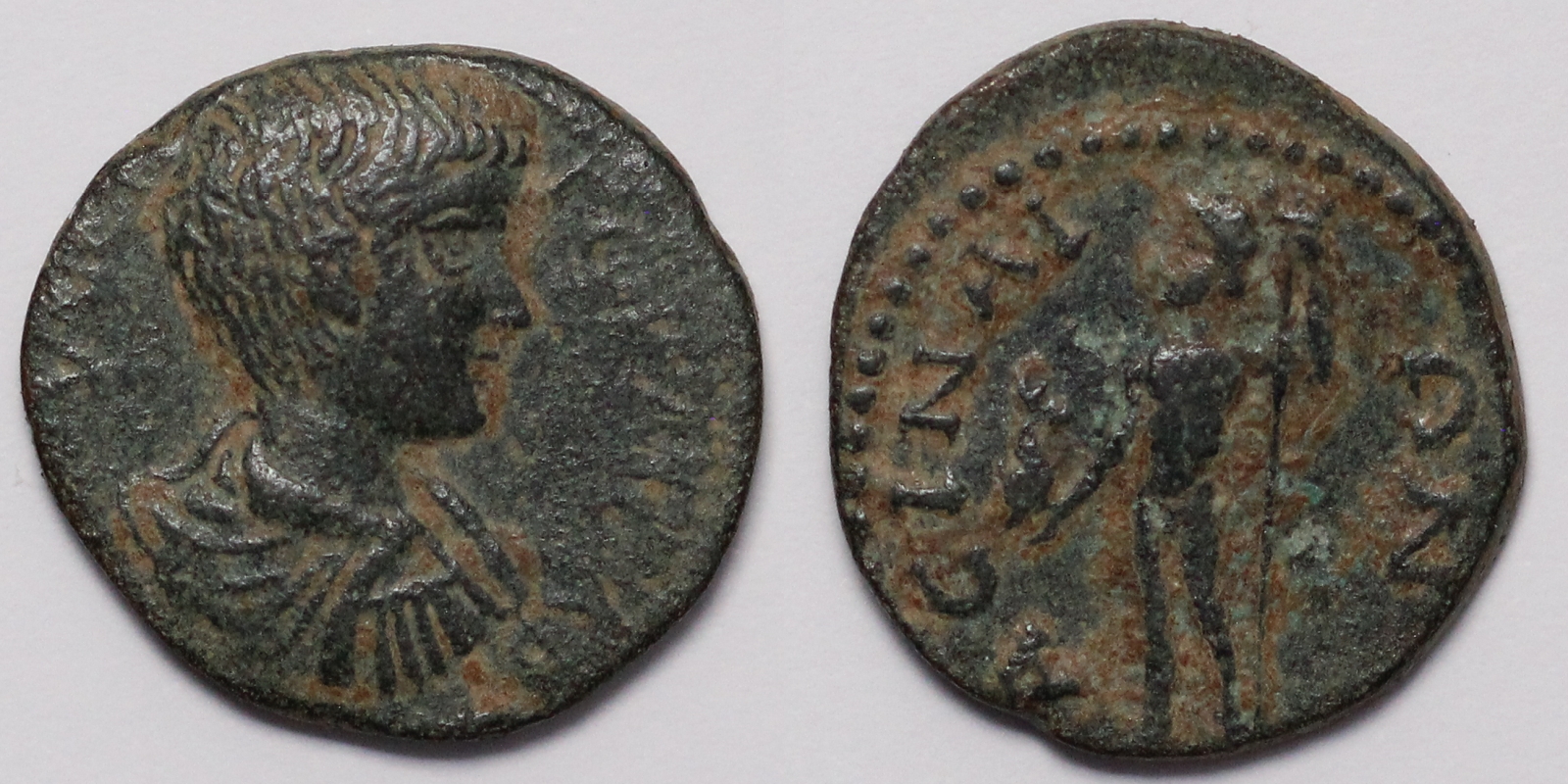 Bare-headed and draped bust of Geta to right. / Poseidon standing left, holding dolphin in his right hand and trident in his left.