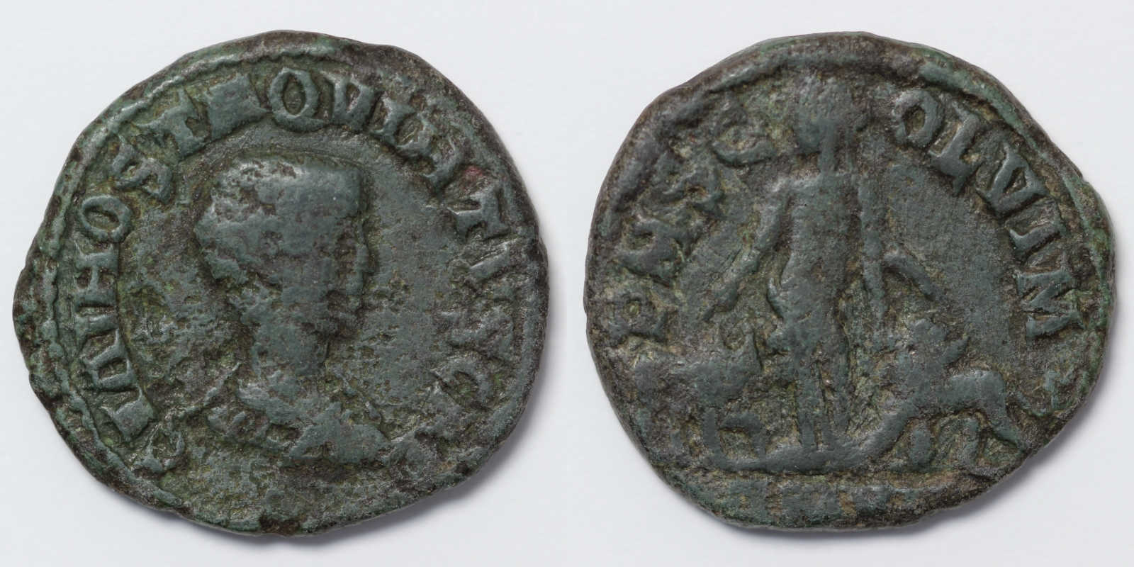 Obv: C VAL HOST M QVINTVS CAE; Bare head of Hostilian to r.