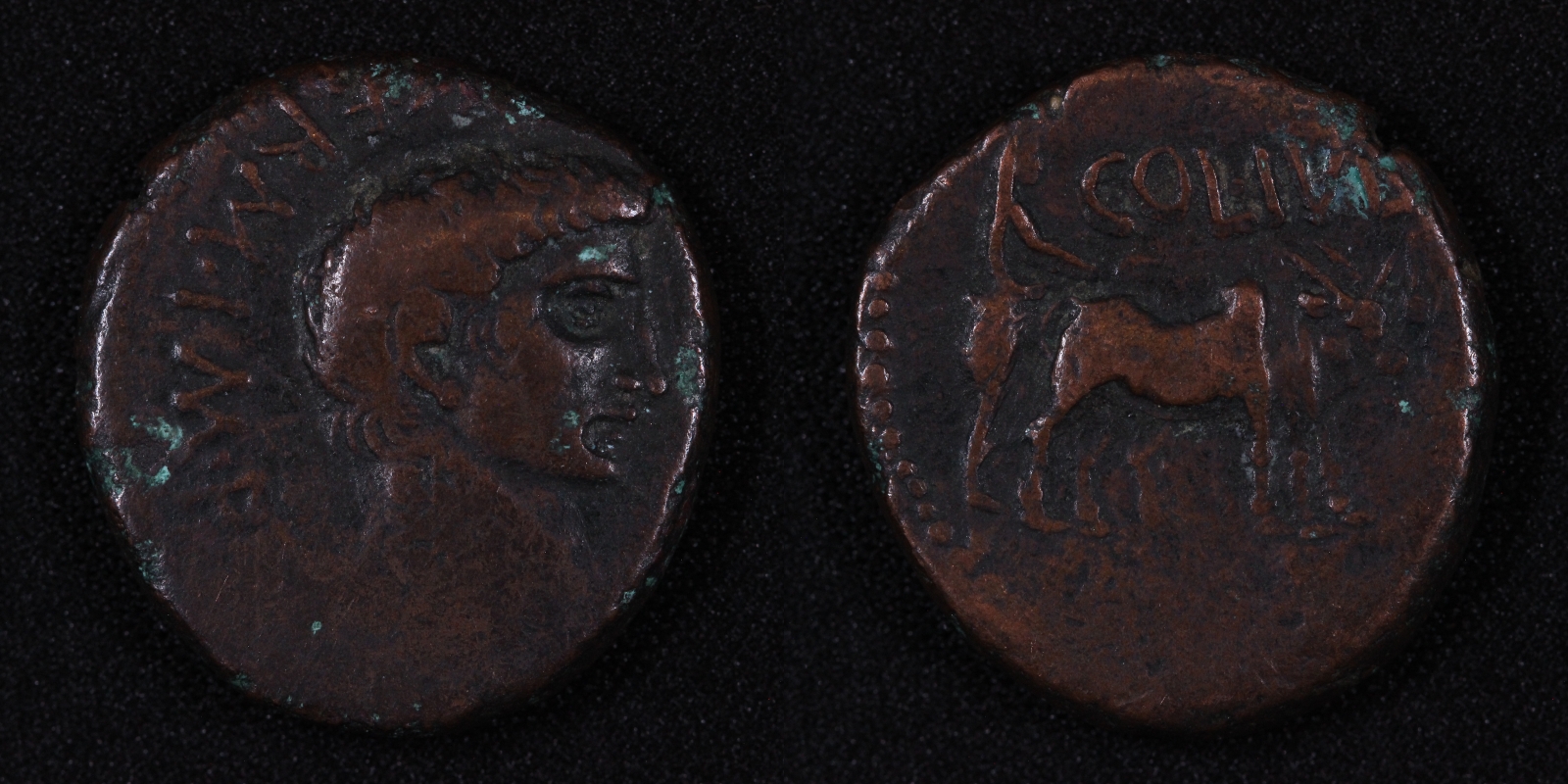 Rev: COL IVL; Veiled figure ploughing, r., with two oxen.