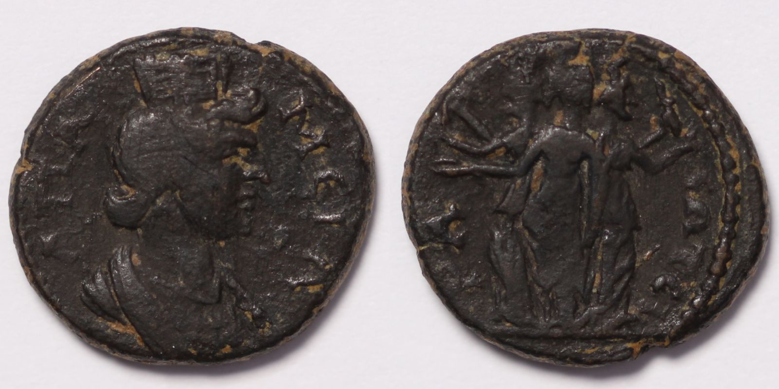 Obv: AΠAMЄIA; Turreted and draped bust of Tyche right.