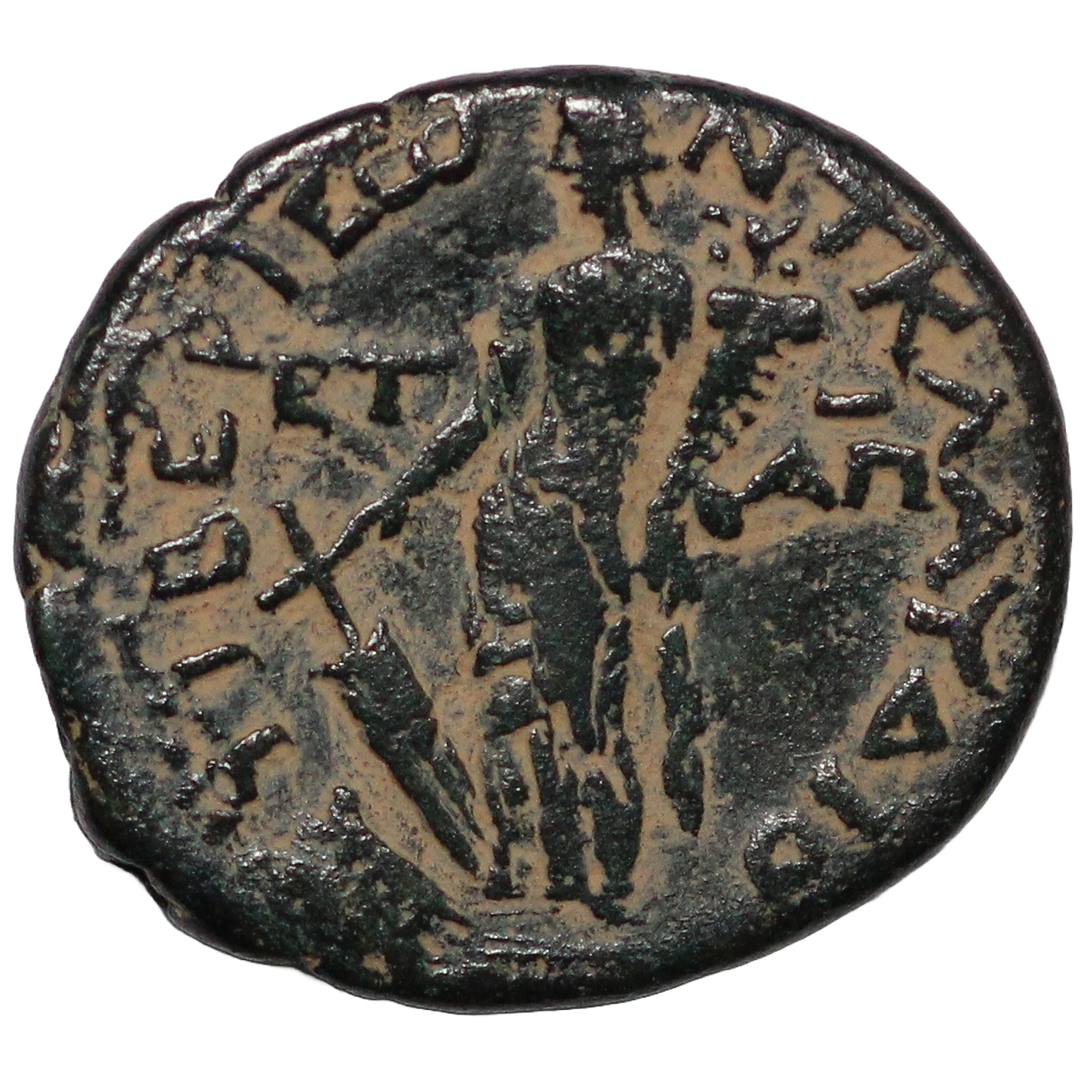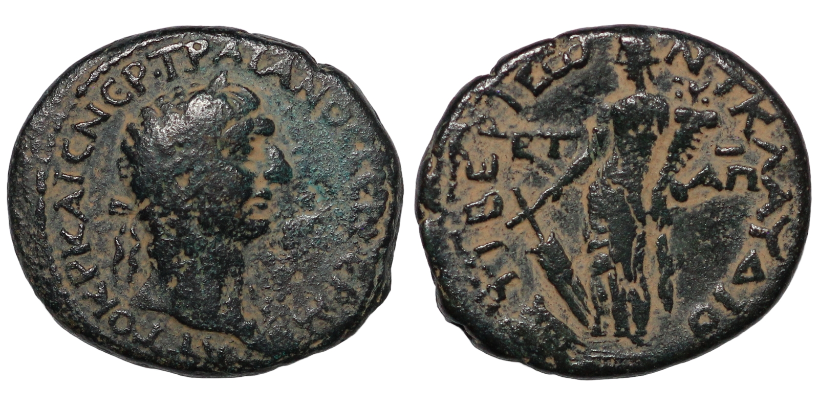 Laureate bust right, aegis on shoulder / Tyche standing left, holding rudder and cornucopia; ET AΠ (date) across field.