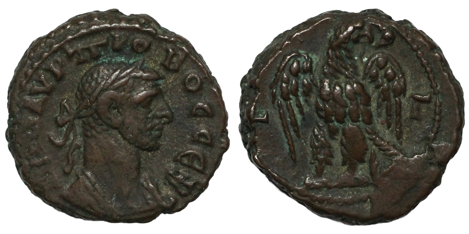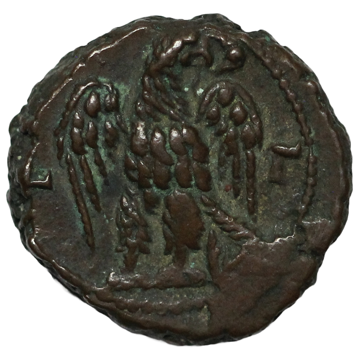 Laureate and cuirassed bust right / Eagle standing right, holding wreath in beak, palm over shoulder; L Γ (date) across field.