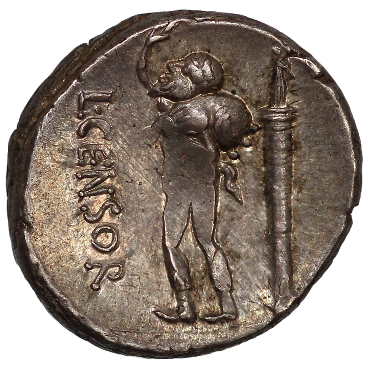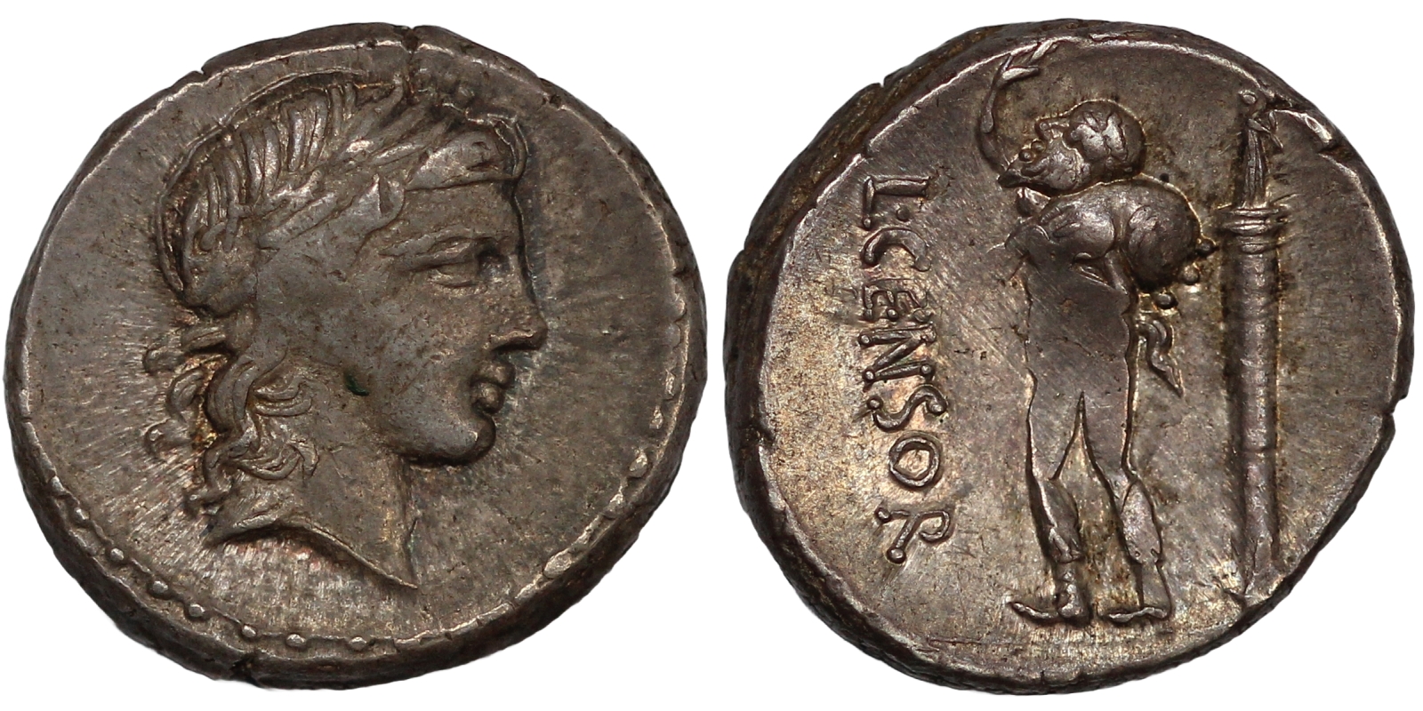 Laureate head of Apollo r. / L CENSOR, Marsyas walking l. bearing wine-skin on shoulder; behind, statue on column.