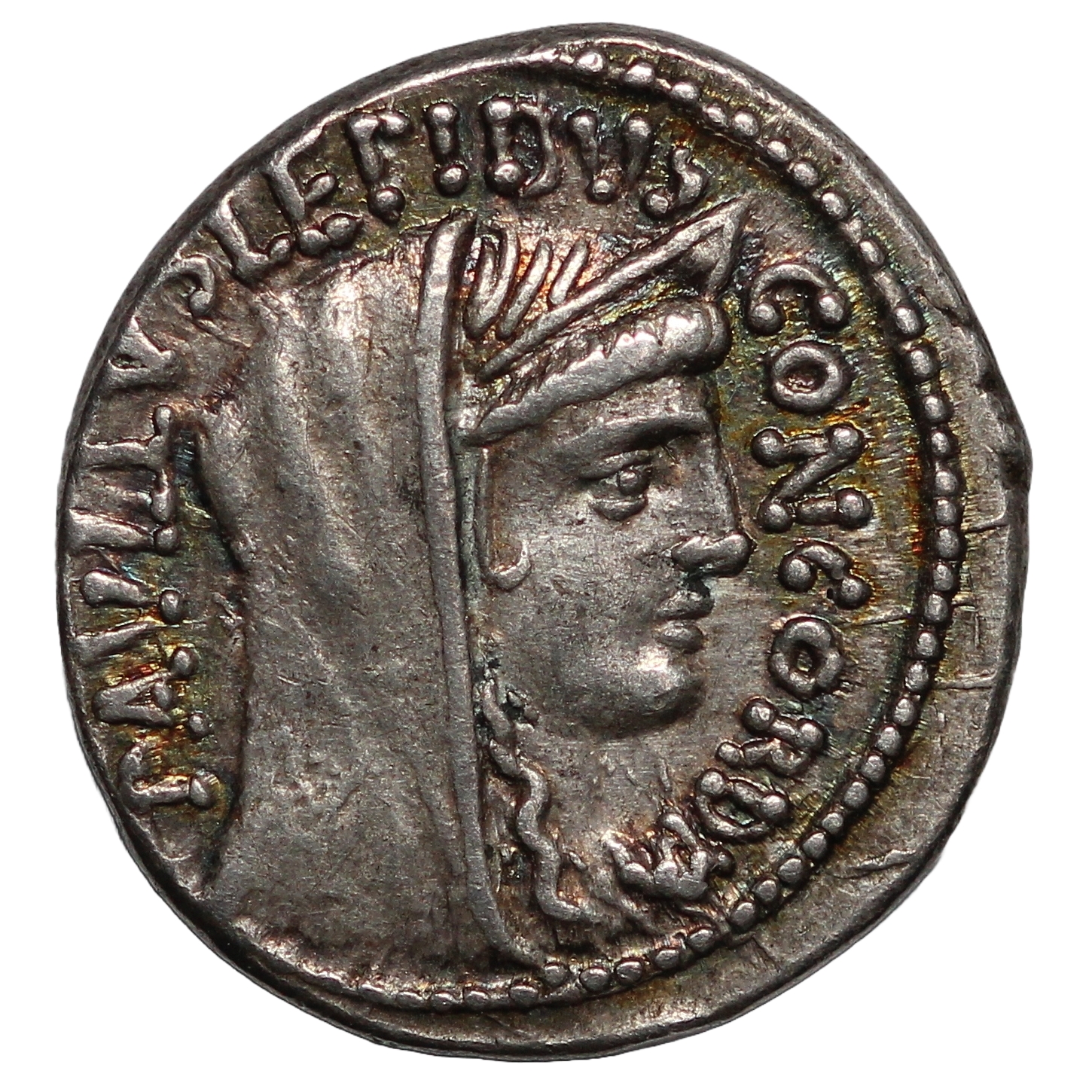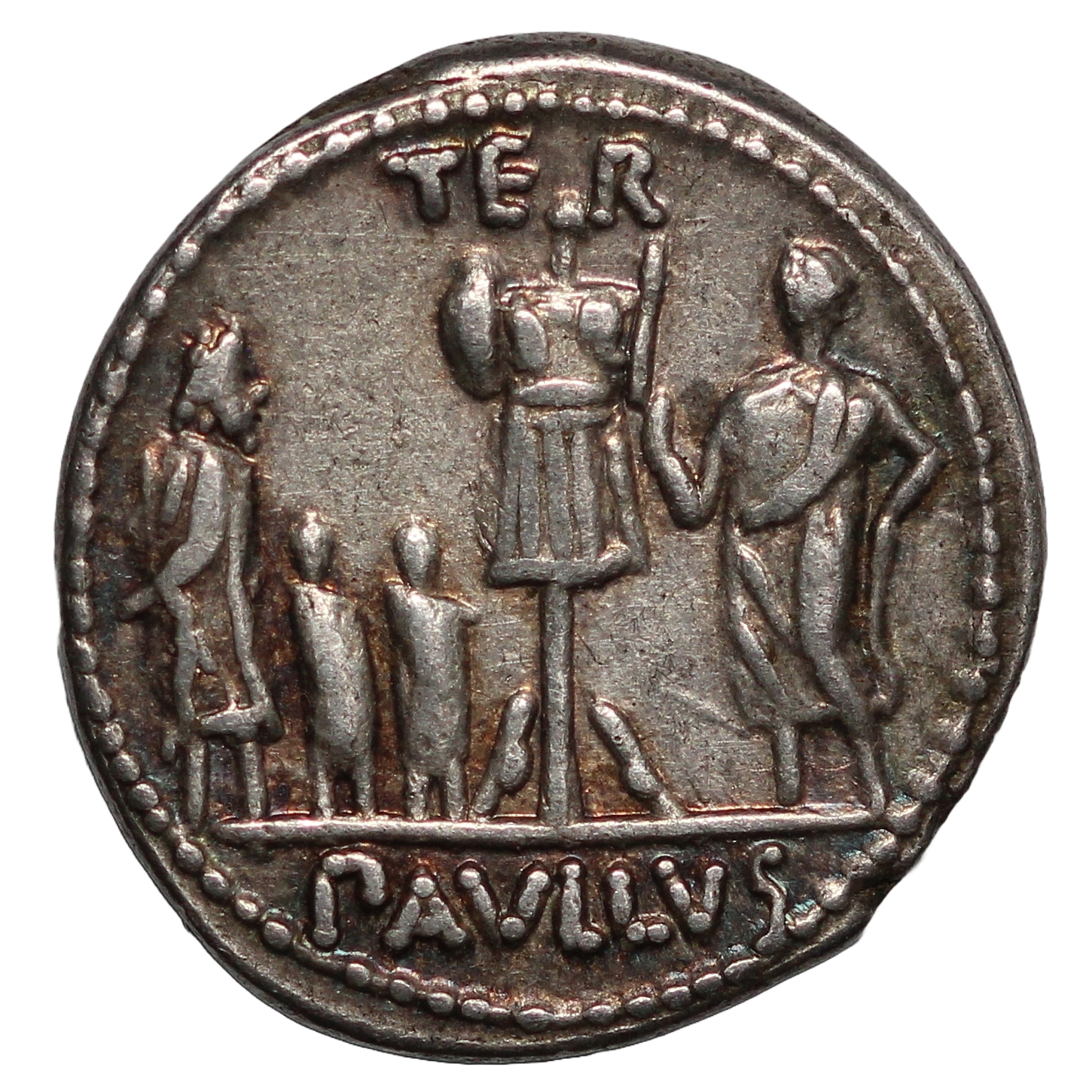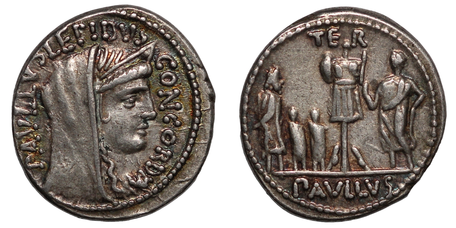 Veiled and diademed head of Concordia r.; on l., PAVLLVS·LEPIDVS upwards; on r., CONCORDIA downwards / Trophy; above, TER; on r., togate figure (L. Aemilius Paullus); on l., three captives (King Perseus of Macedon and his sons); in exergue, PAVLLVS.