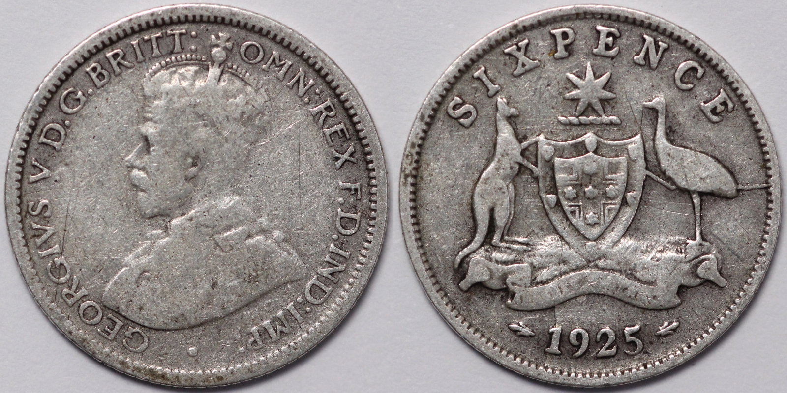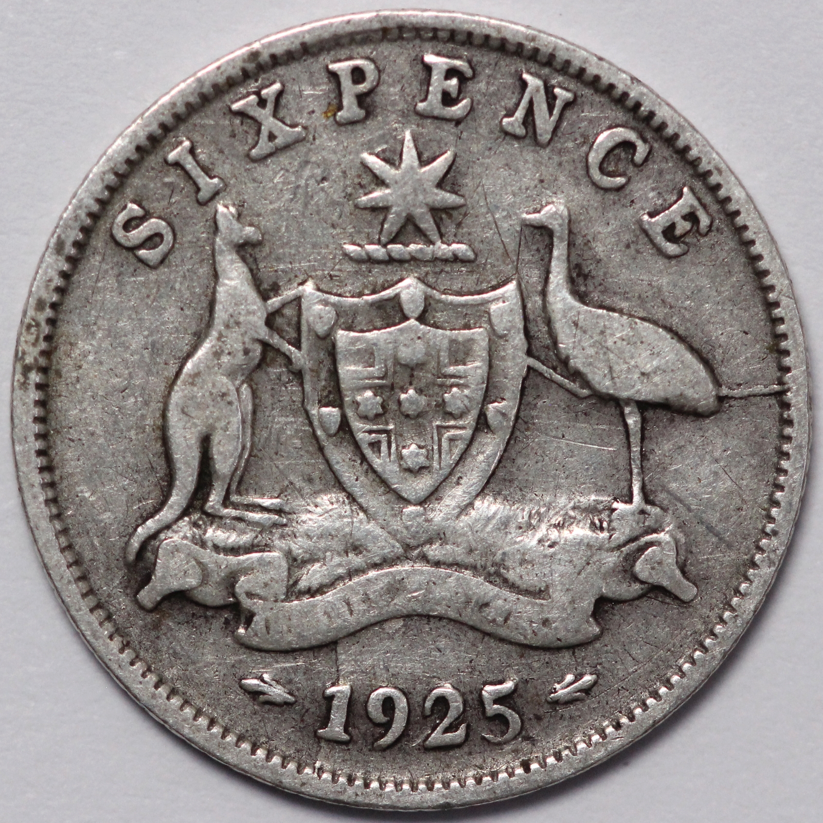 Australia 1925 George V Sixpence. Die crack from emu tail to rim, “3-legged emu” error.