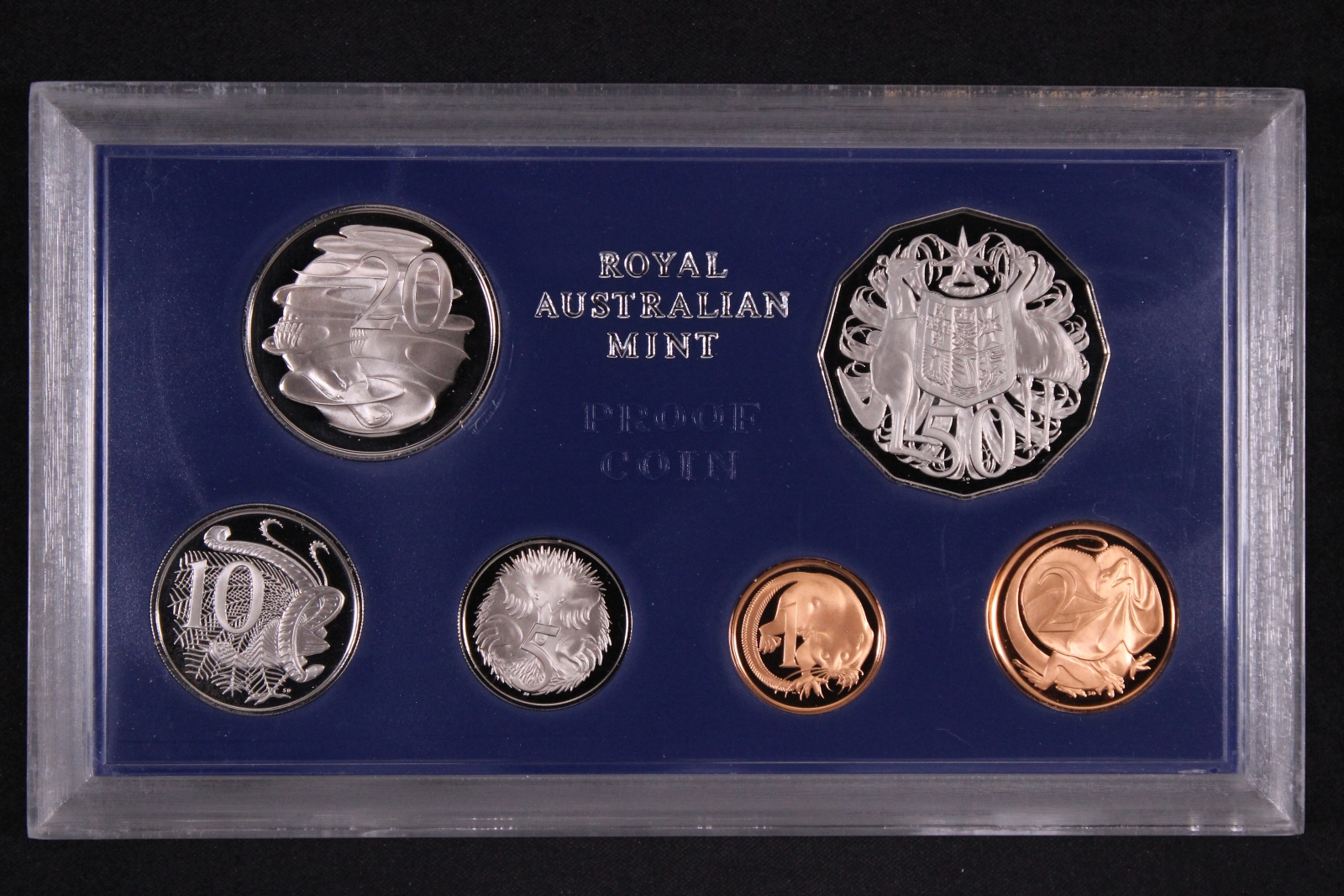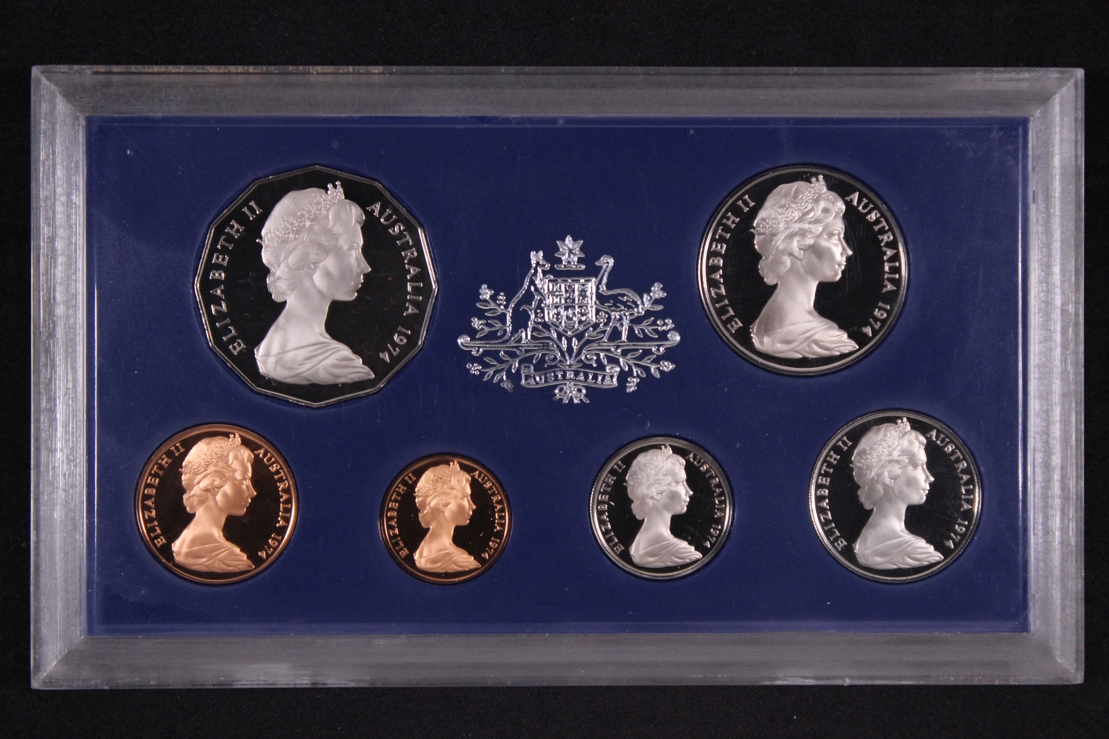 Australia 1974 proof coin set struck and packaged by the Royal Australian Mint. Comes with outer foam packaging. Scarce date – only 11,103 sets issued.