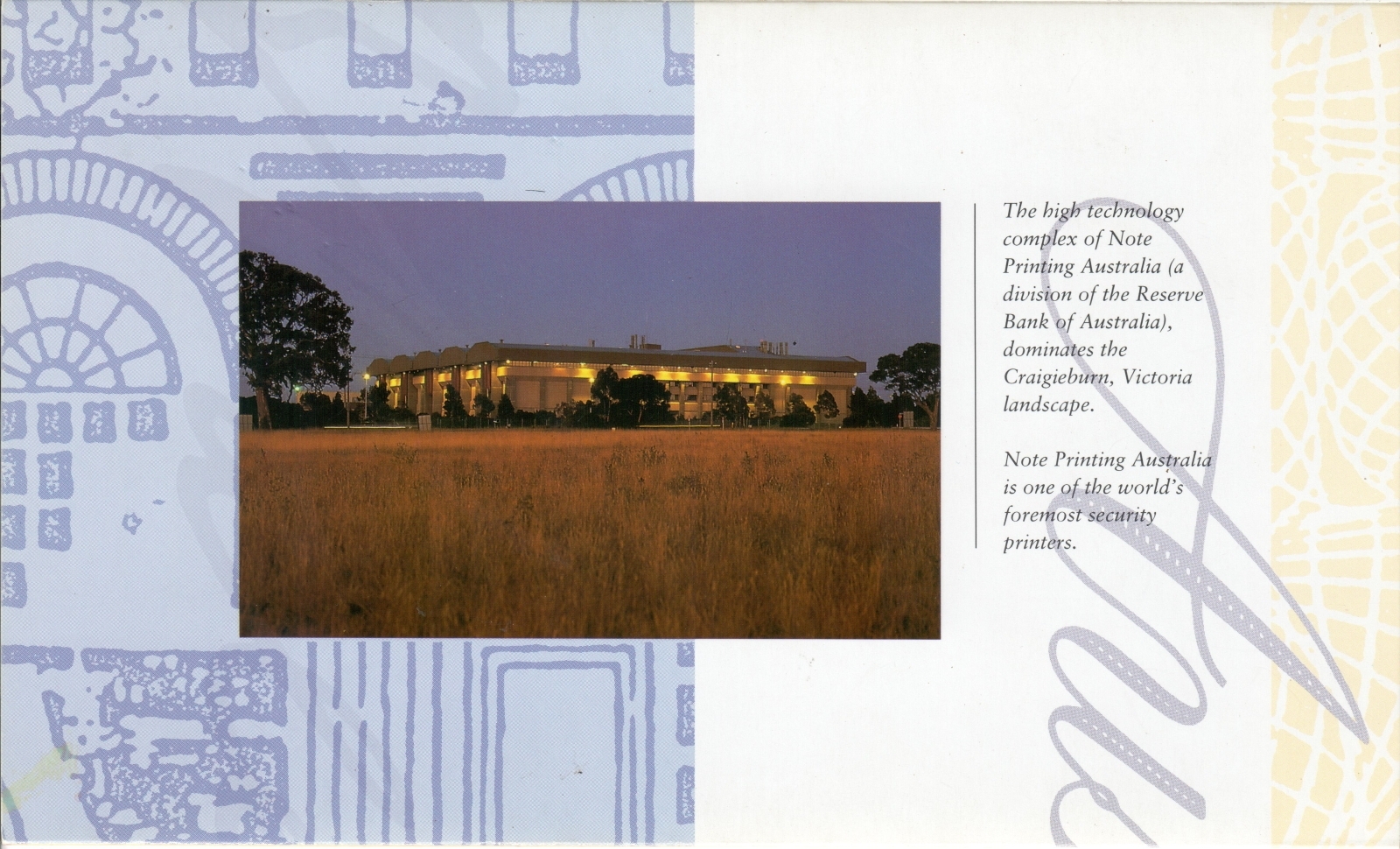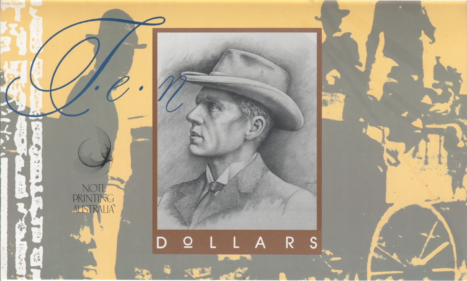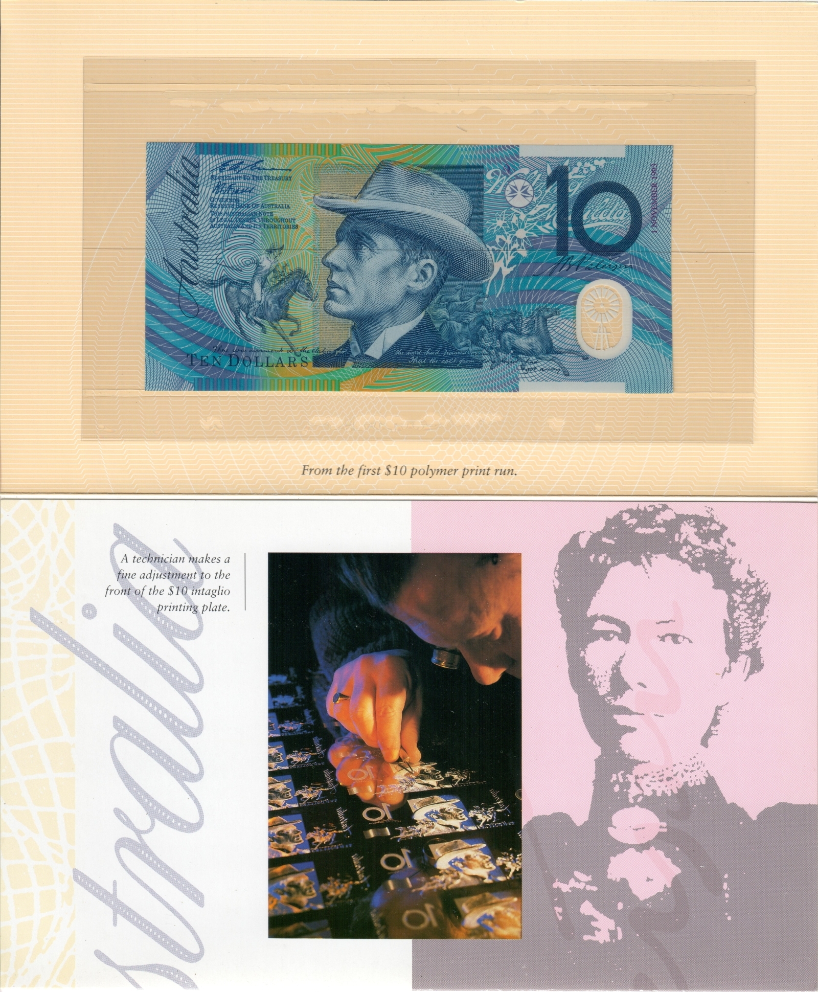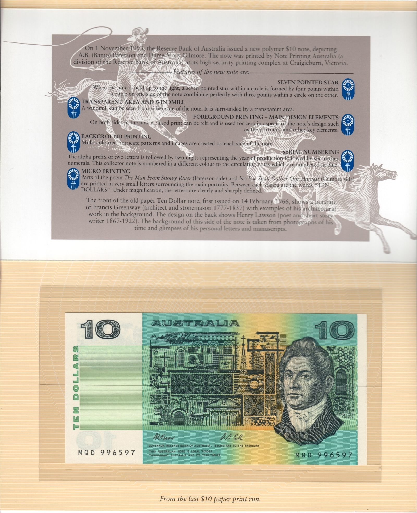 1993 Note Printing Australia folder with first polymer $10 note and last paper note. The polymer note has purple serials and has been overprinted with day of issue (1 November 1993).