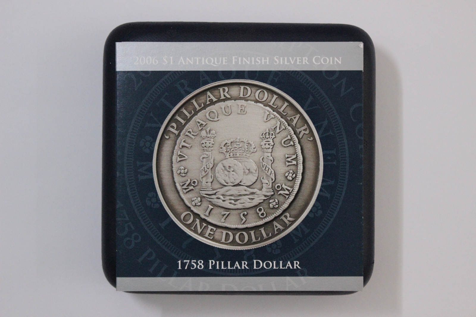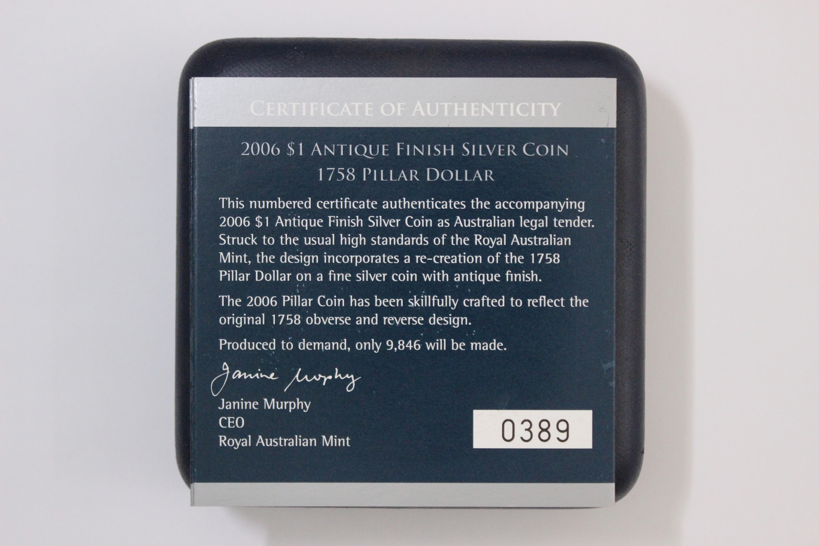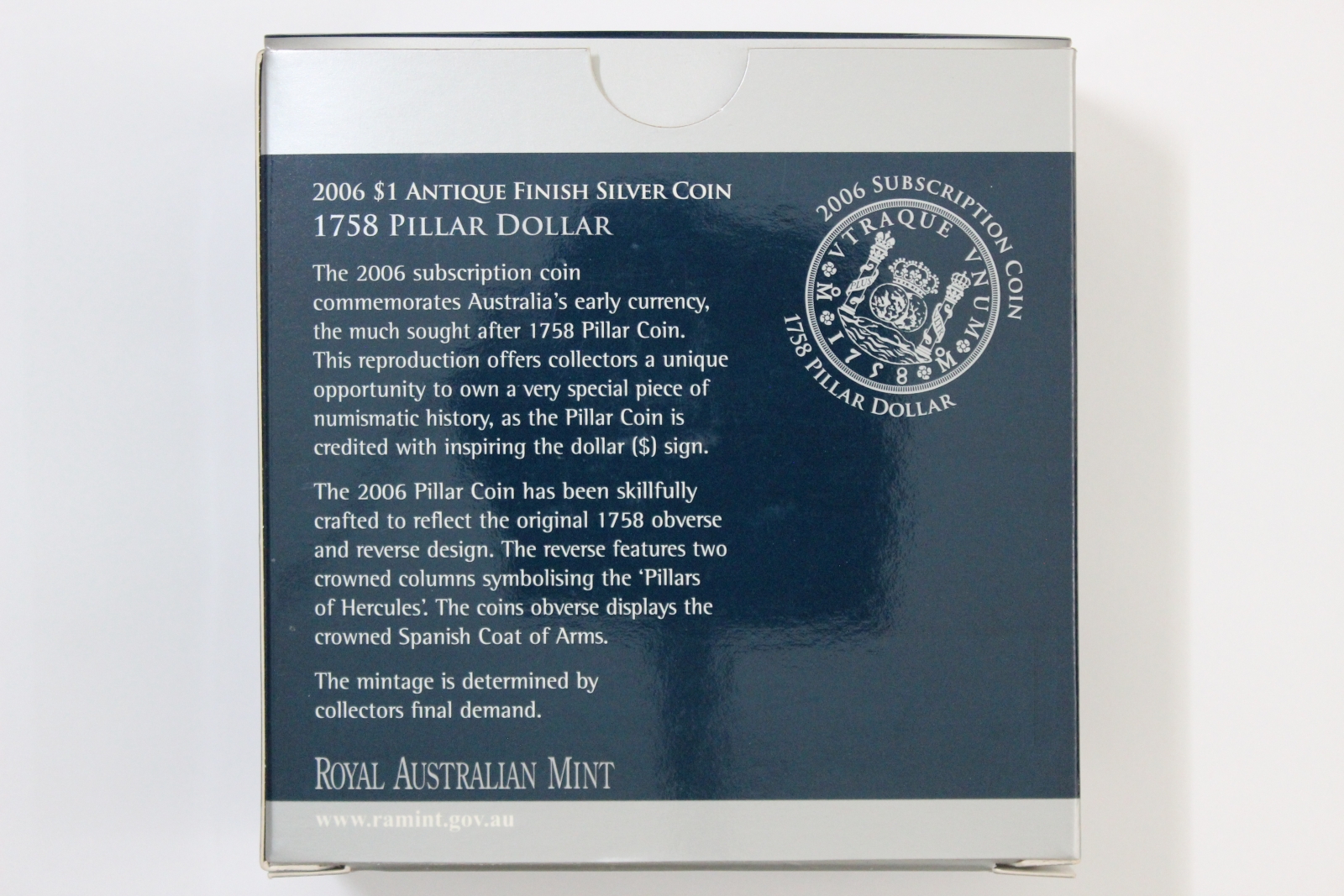Australia 2006 Subscription $1 Antique Finish Silver Coin ‘1758 Pillar Dollar’ minted by the Royal Australian Mint. Coin in capsule, accompanied with numbered CoA, presentation case and outer cardboard box.