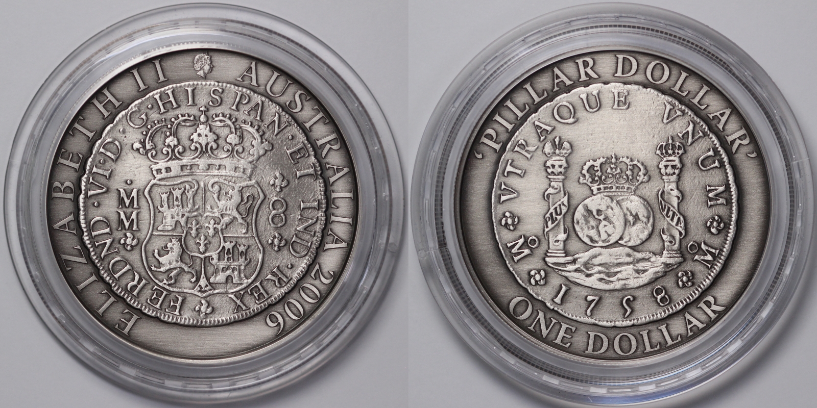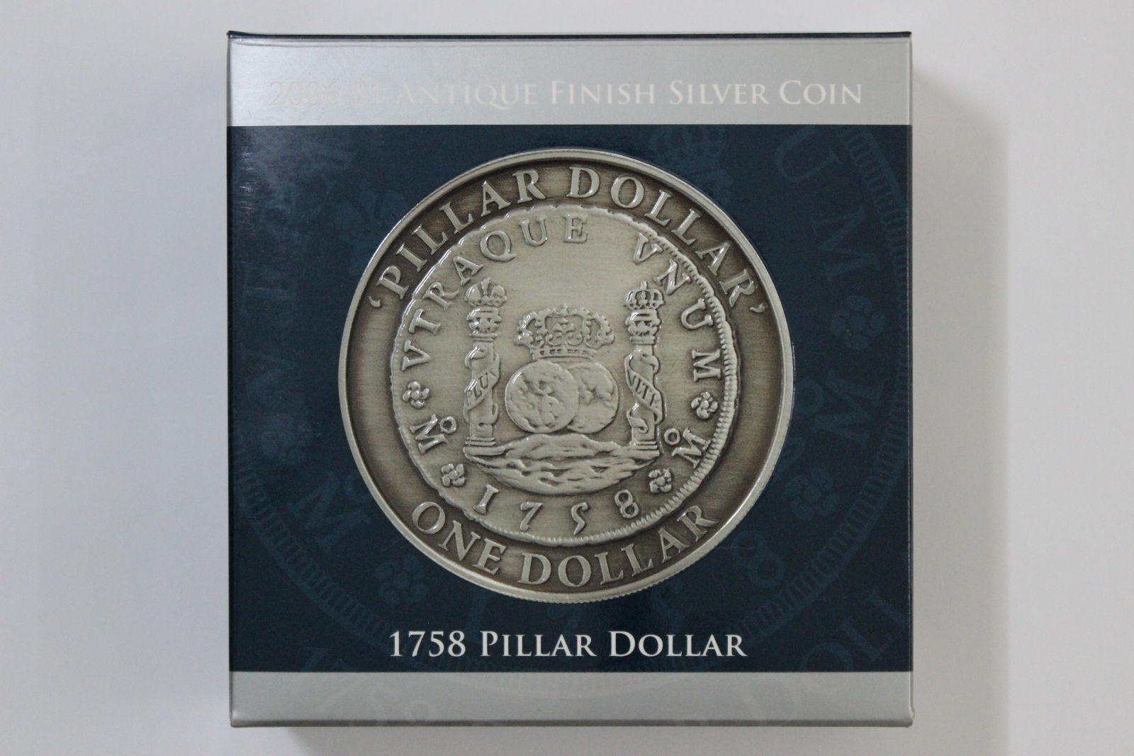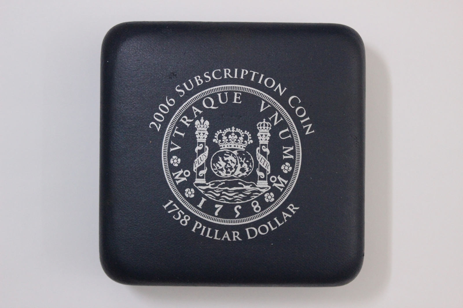 Australia 2006 Subscription $1 Antique Finish Silver Coin ‘1758 Pillar Dollar’ minted by the Royal Australian Mint. Coin in capsule, accompanied with numbered CoA, presentation case and outer cardboard box.