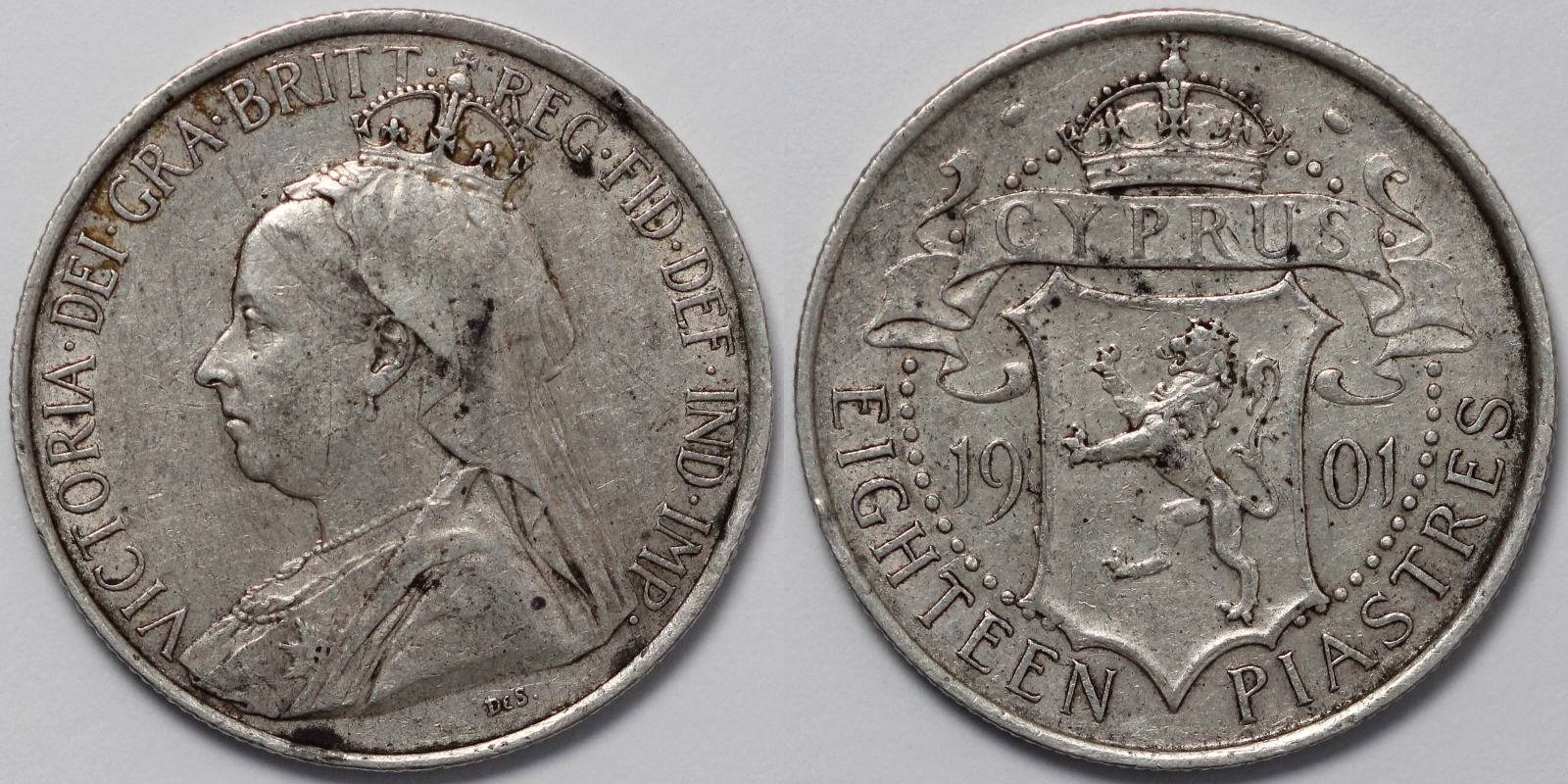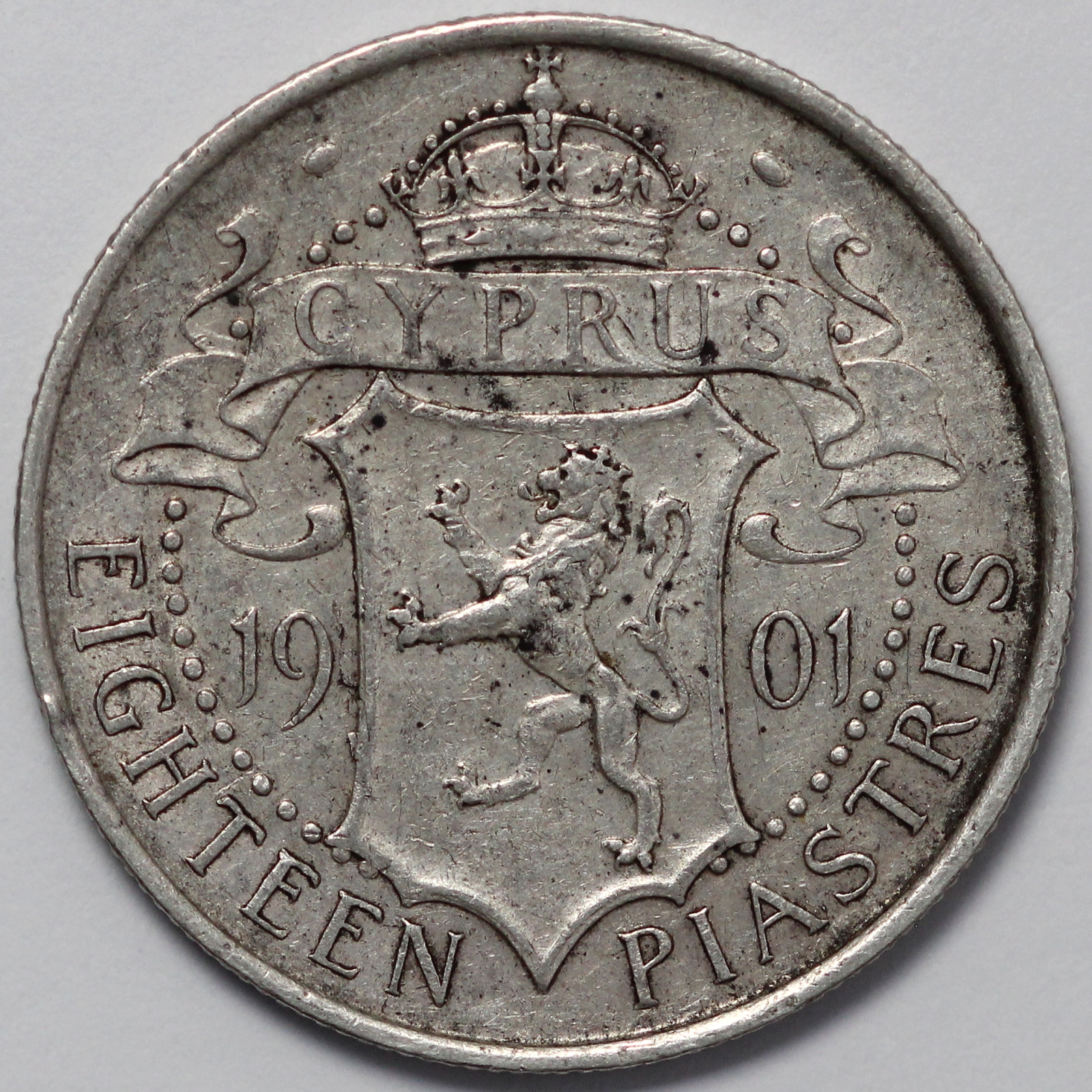 Cyprus 1901 18 Piastres. Victoria. Royal Mint. KM# 7. Scarce coin.
