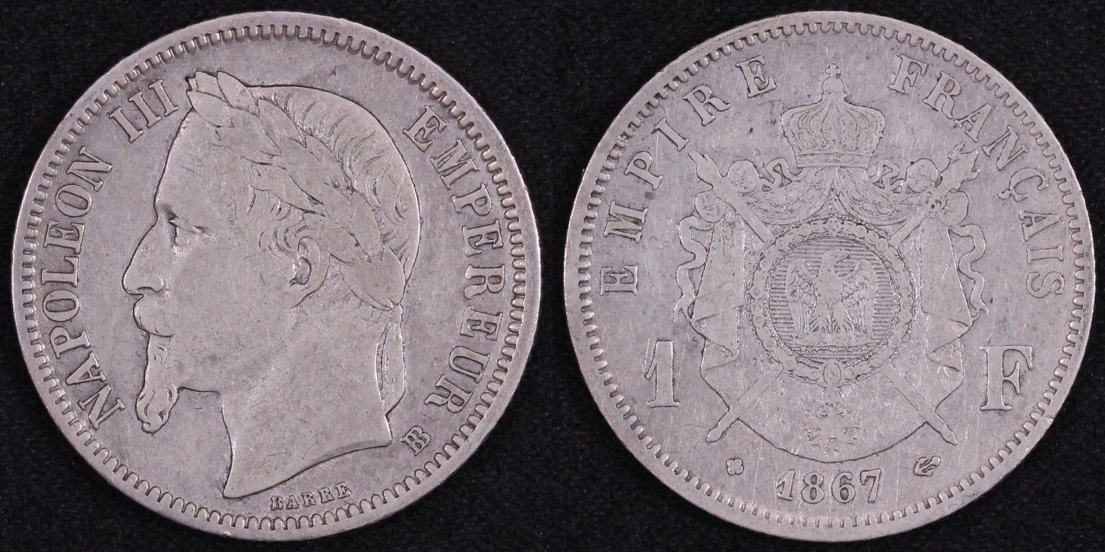 France 1867-BB 1 Franc KM# 806.2 Napoleon III Strasbourg Mint World Silver Coin