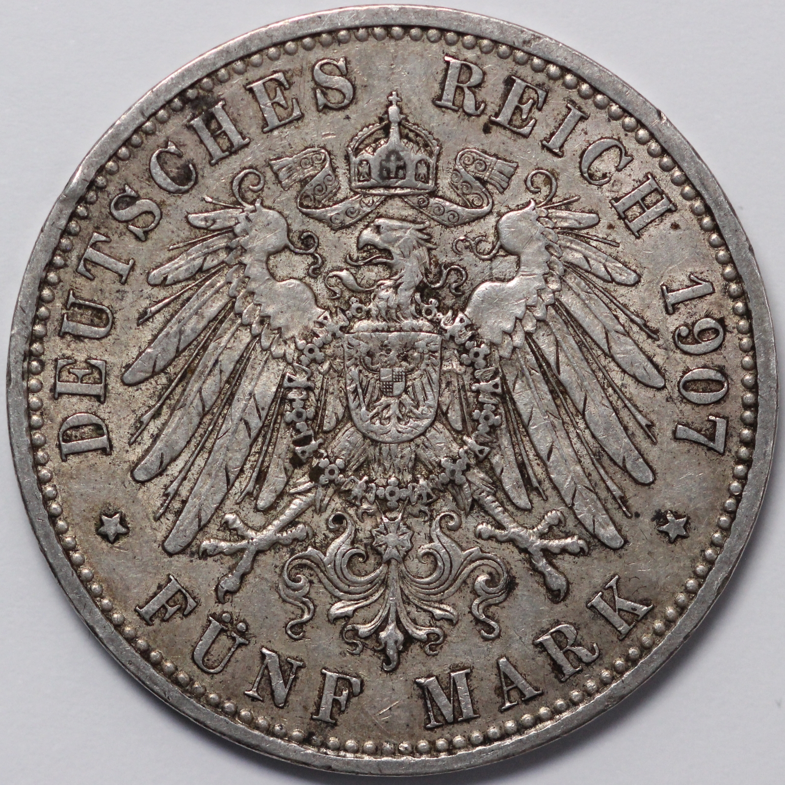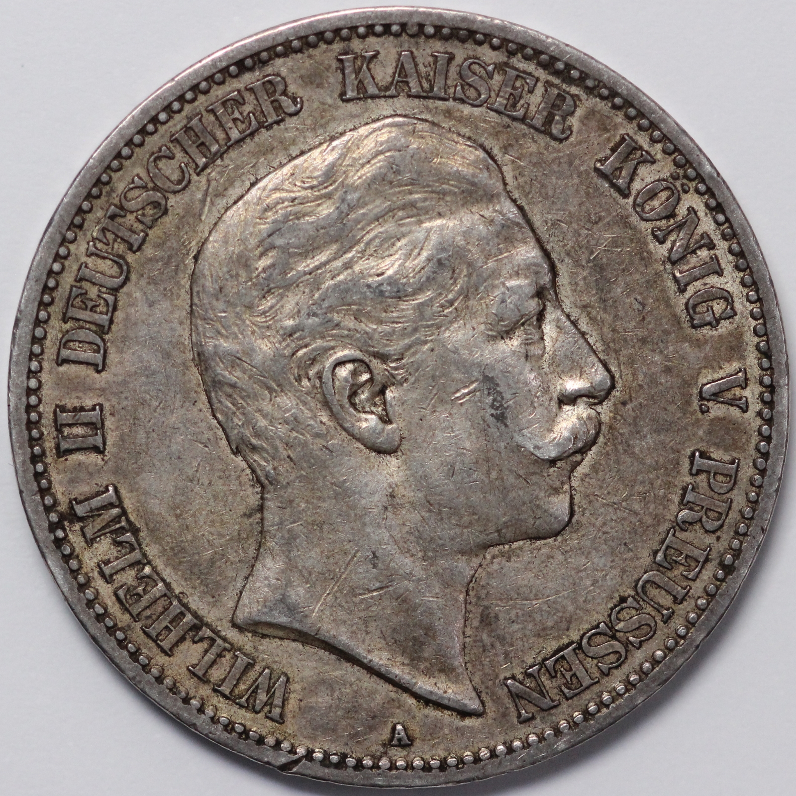 German States – Prussia 1907-A 5 Mark. Wilhelm II. Berlin mint. KM# 523.