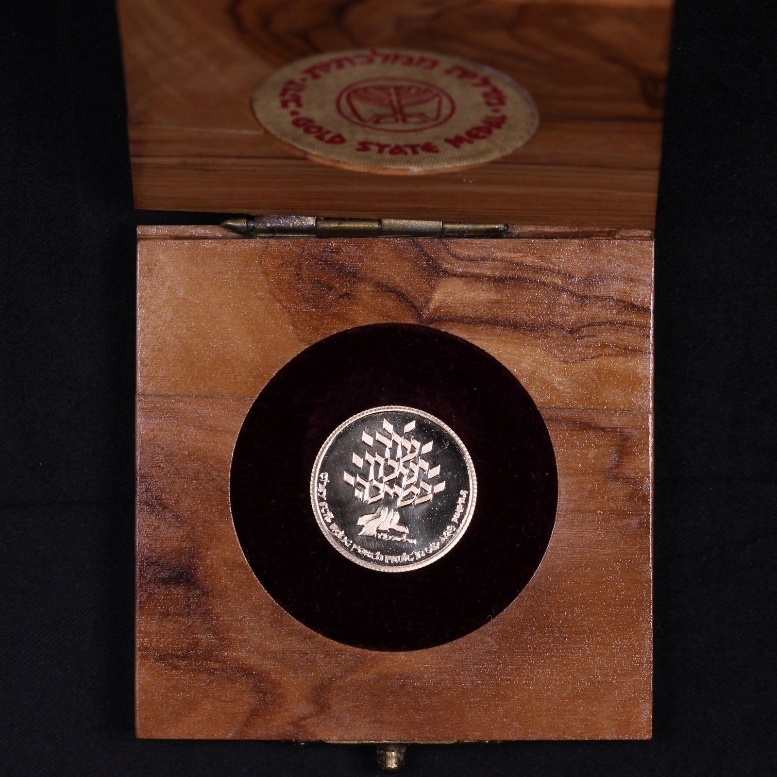 Israel 1982 Honor the Elders Gold State Medal. 18mm, 4.4g of 750/1000 (18k) gold. Comes with olive wood presentation box. Certificate not included.