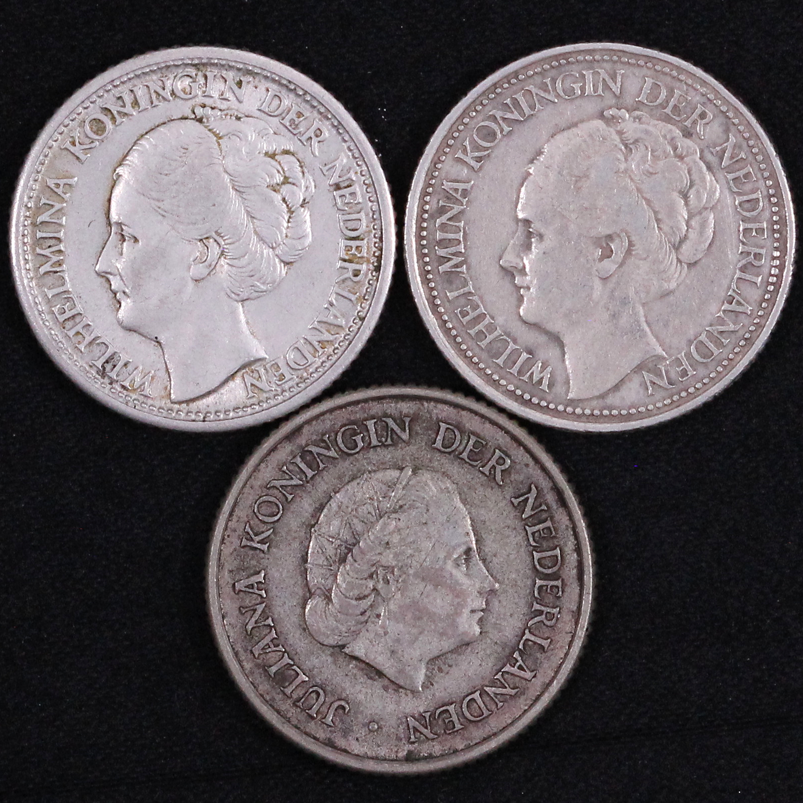 Lot of 3 Netherlands Antilles 1963, Curacao 1944D & 1947 1/4 Gulden Silver Coins