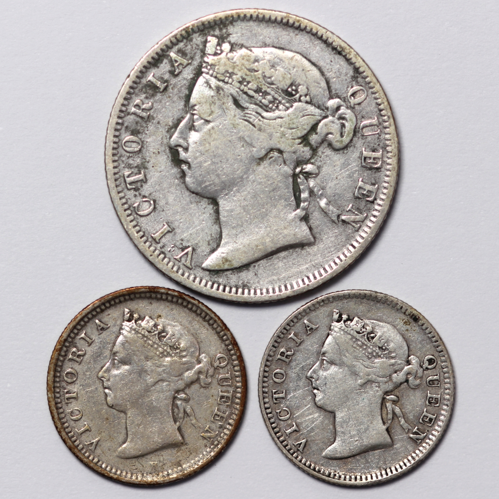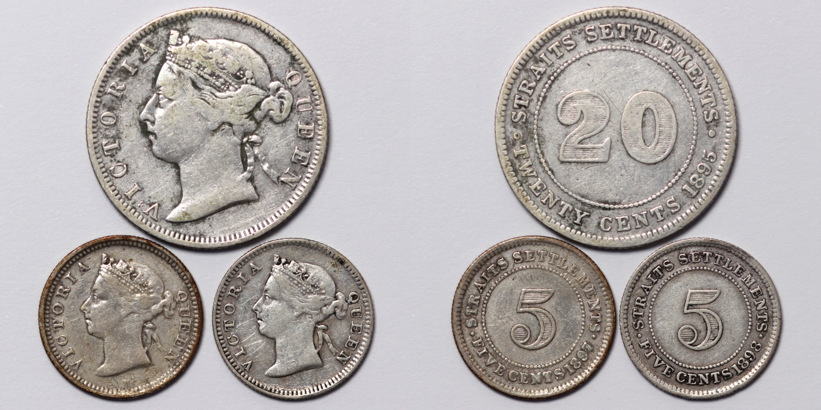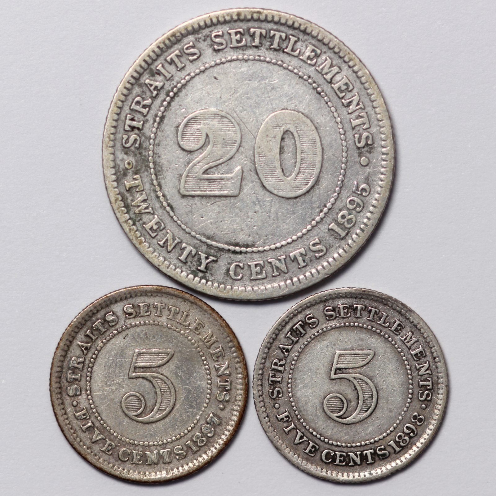 Lot of 3 Straits Settlements 1895 20 Cents, 1897H & 1898 5 Cents Silver Coins