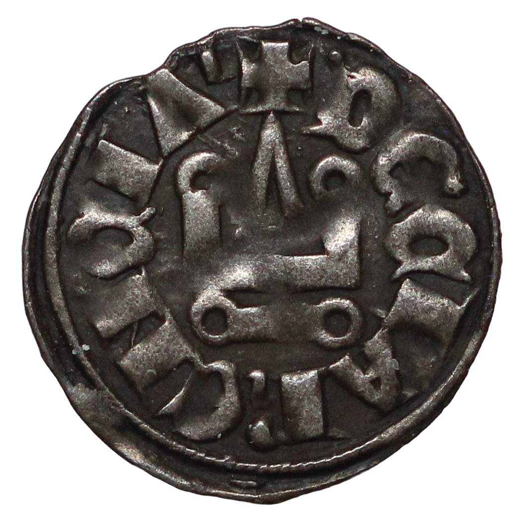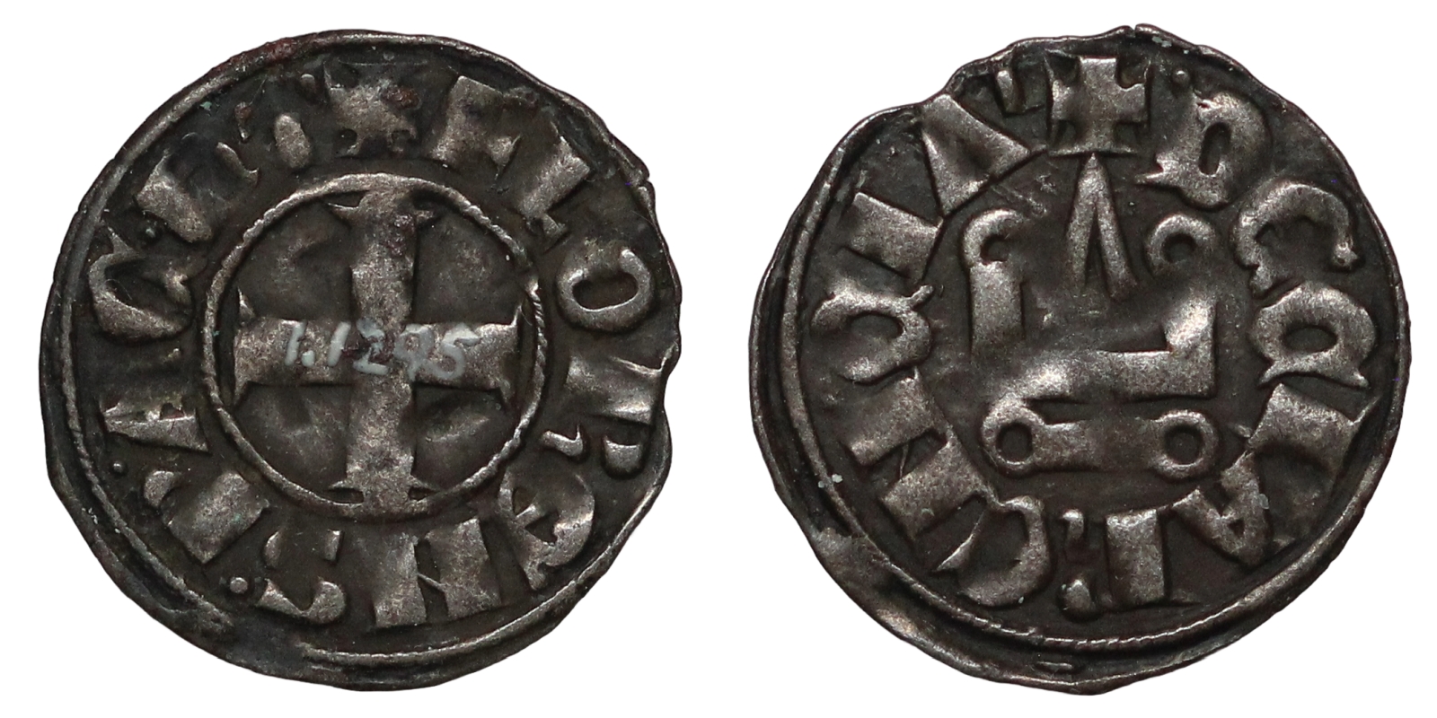+ FLORENS P ACH, cross pattee, collection number 1.1295 in ink in centre of cross. / DE CLARENCIA, castle tournois.