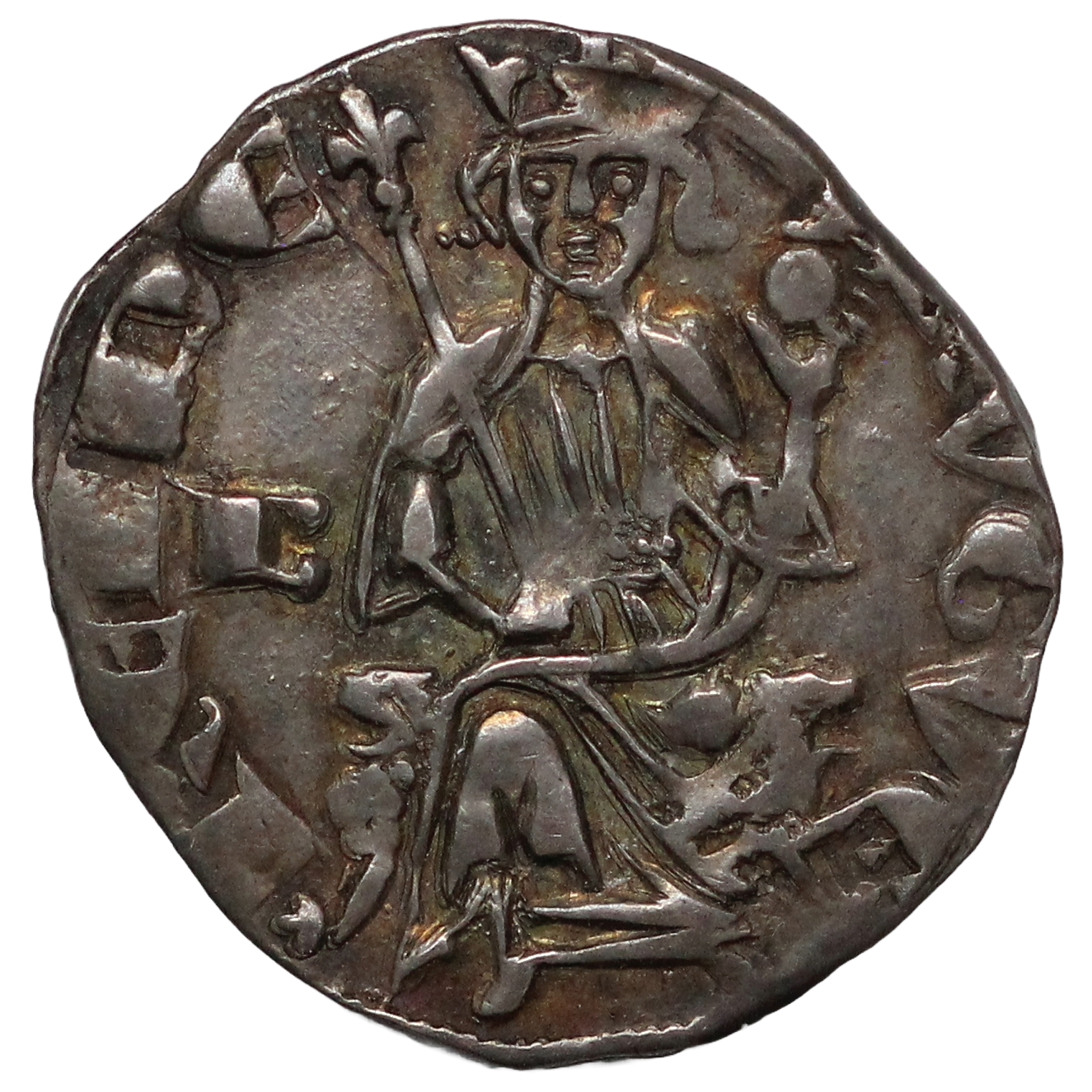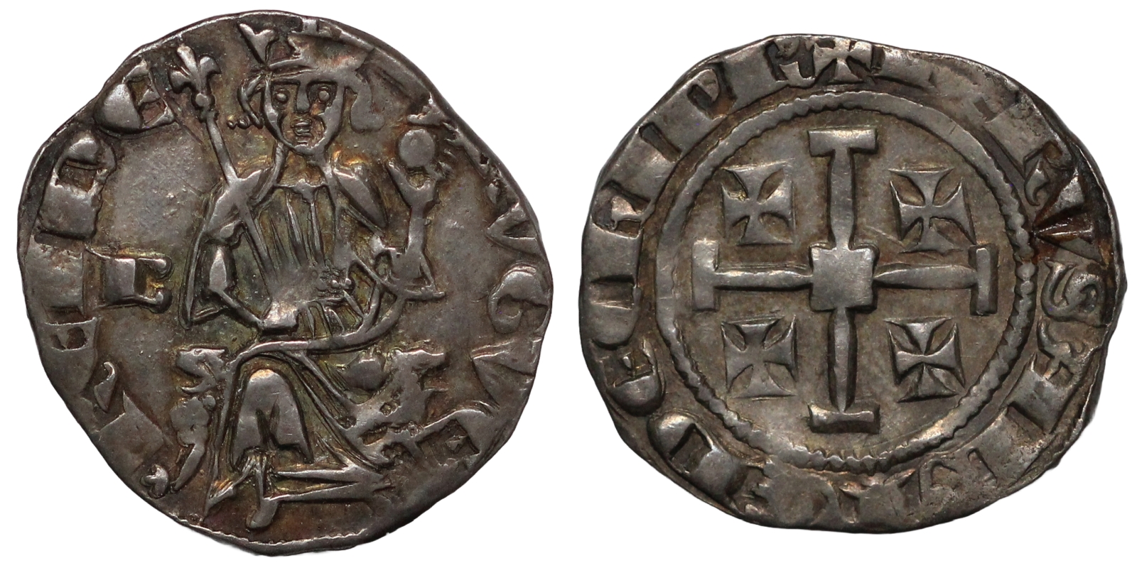 Hugh IV seated on throne facing, holding scepter and orb, B in left field / Jerusalem cross with square centre; crosses in each quarter part.