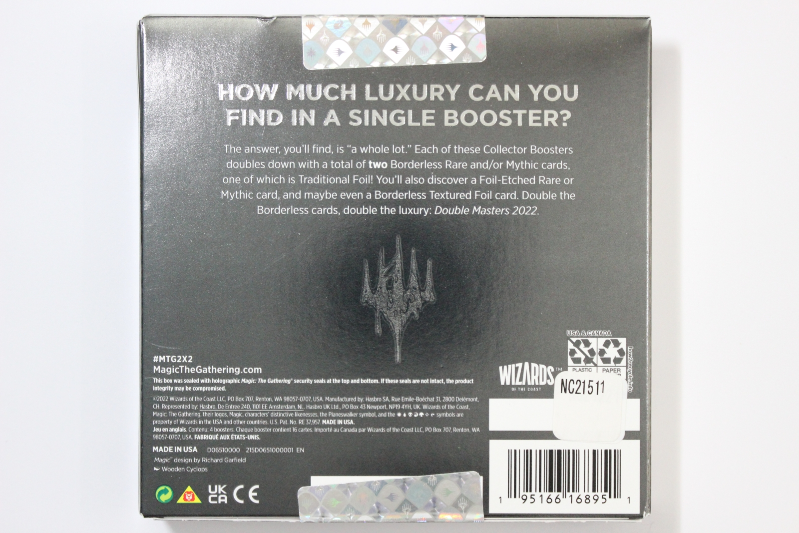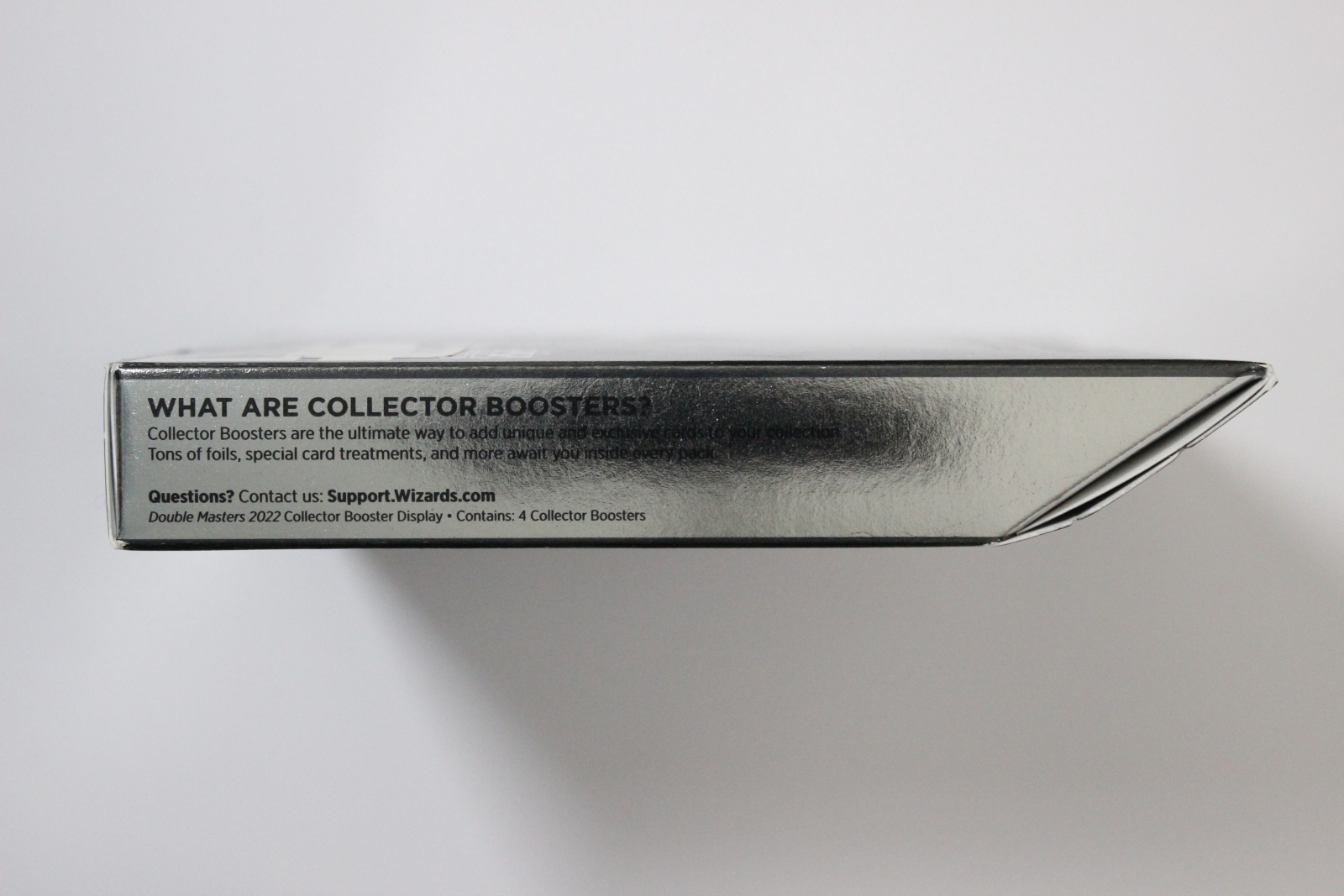 The Double Masters 2022 Collector Booster Box contains 4 Double Masters 2022 Collector Boosters. Each Collector Booster contains 15 cards and 1 Traditional Foil double-sided token, with a combination of 4 cards of rarity Rare or higher, 2–6 Uncommon, and 5–9 Common cards. Every pack contains 10–11 Traditional Foil cards and 1 Rare or Mythic Rare Foil-Etched card.