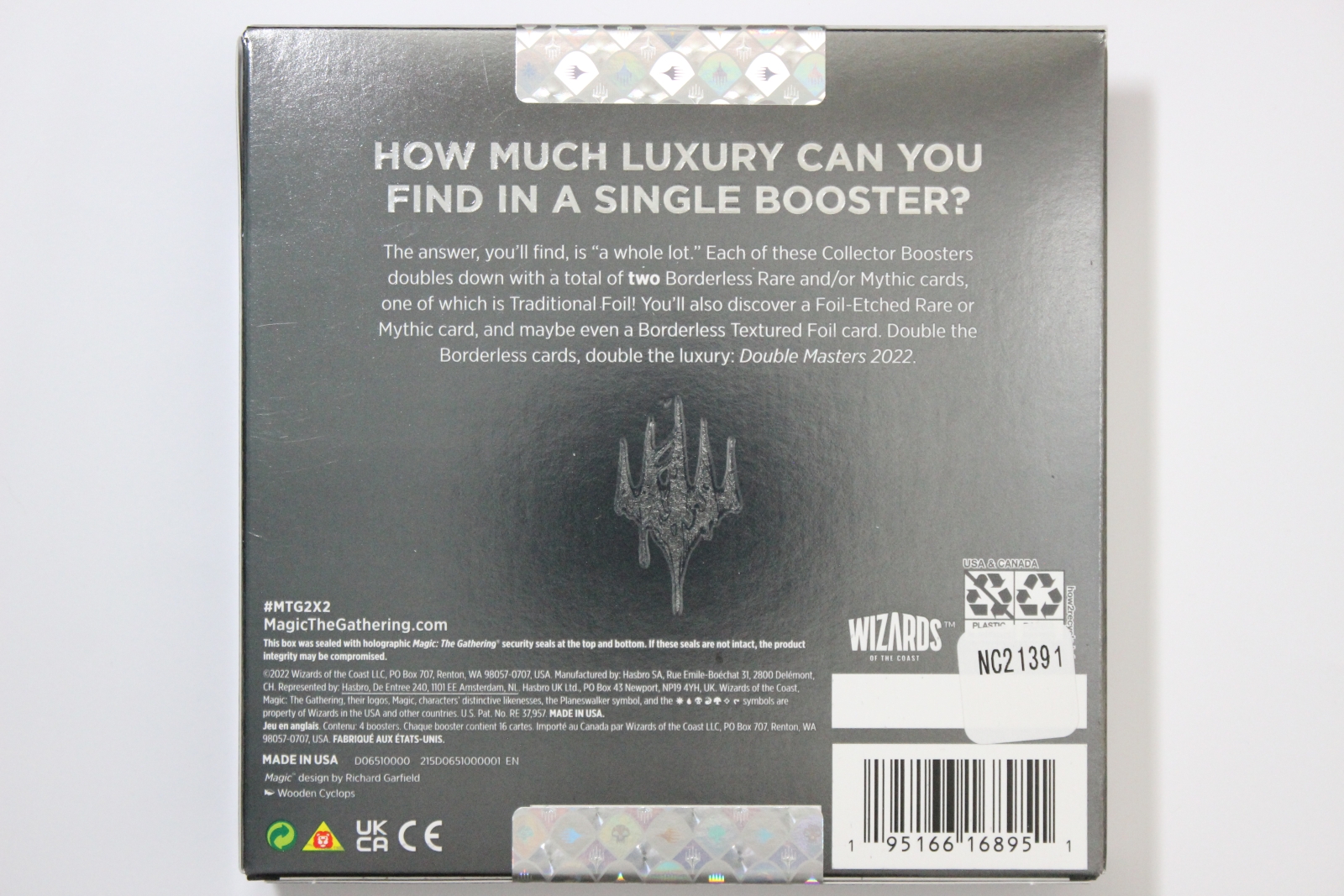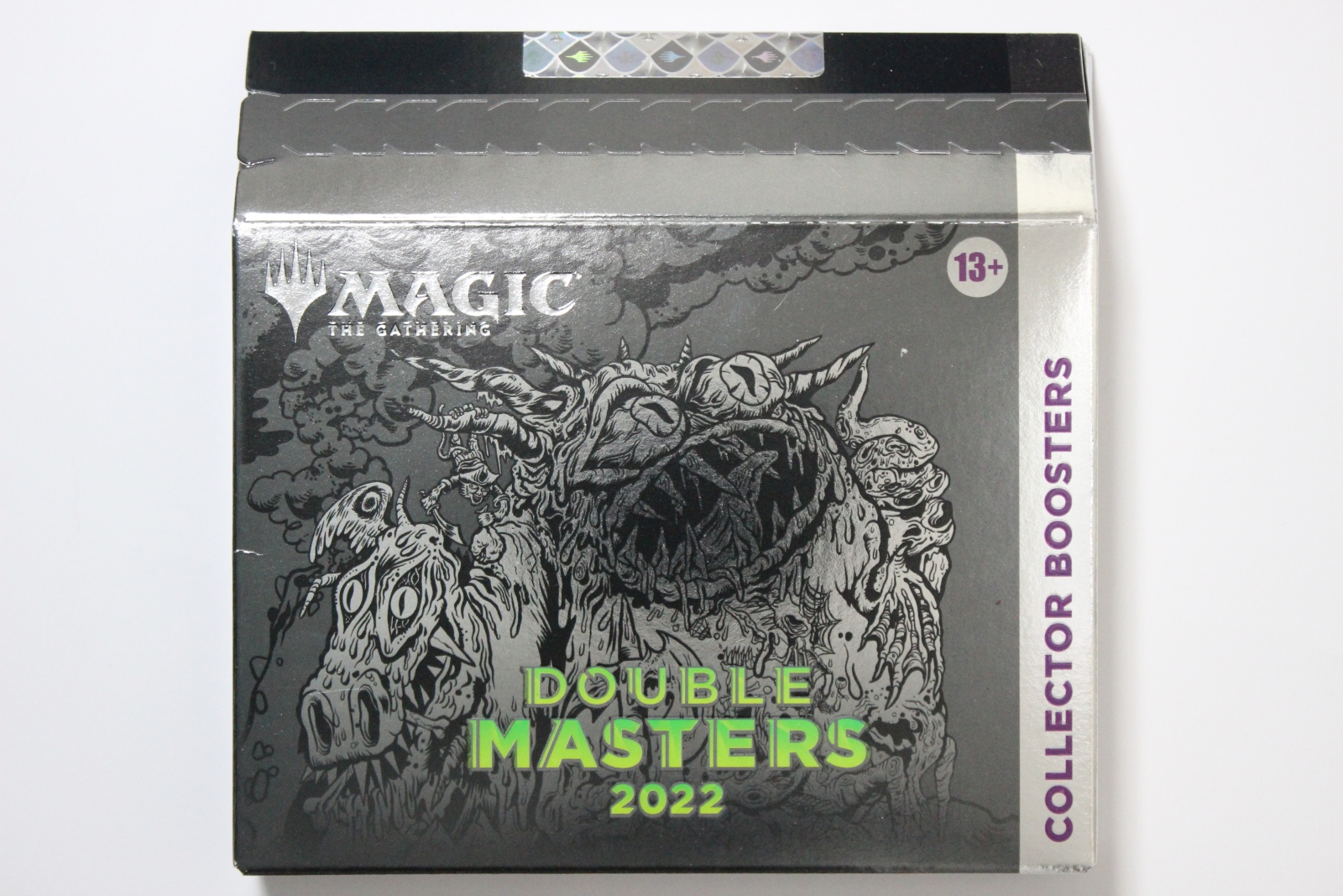 The Double Masters 2022 Collector Booster Box contains 4 Double Masters 2022 Collector Boosters. Each Collector Booster contains 15 cards and 1 Traditional Foil double-sided token, with a combination of 4 cards of rarity Rare or higher, 2–6 Uncommon, and 5–9 Common cards. Every pack contains 10–11 Traditional Foil cards and 1 Rare or Mythic Rare Foil-Etched card.