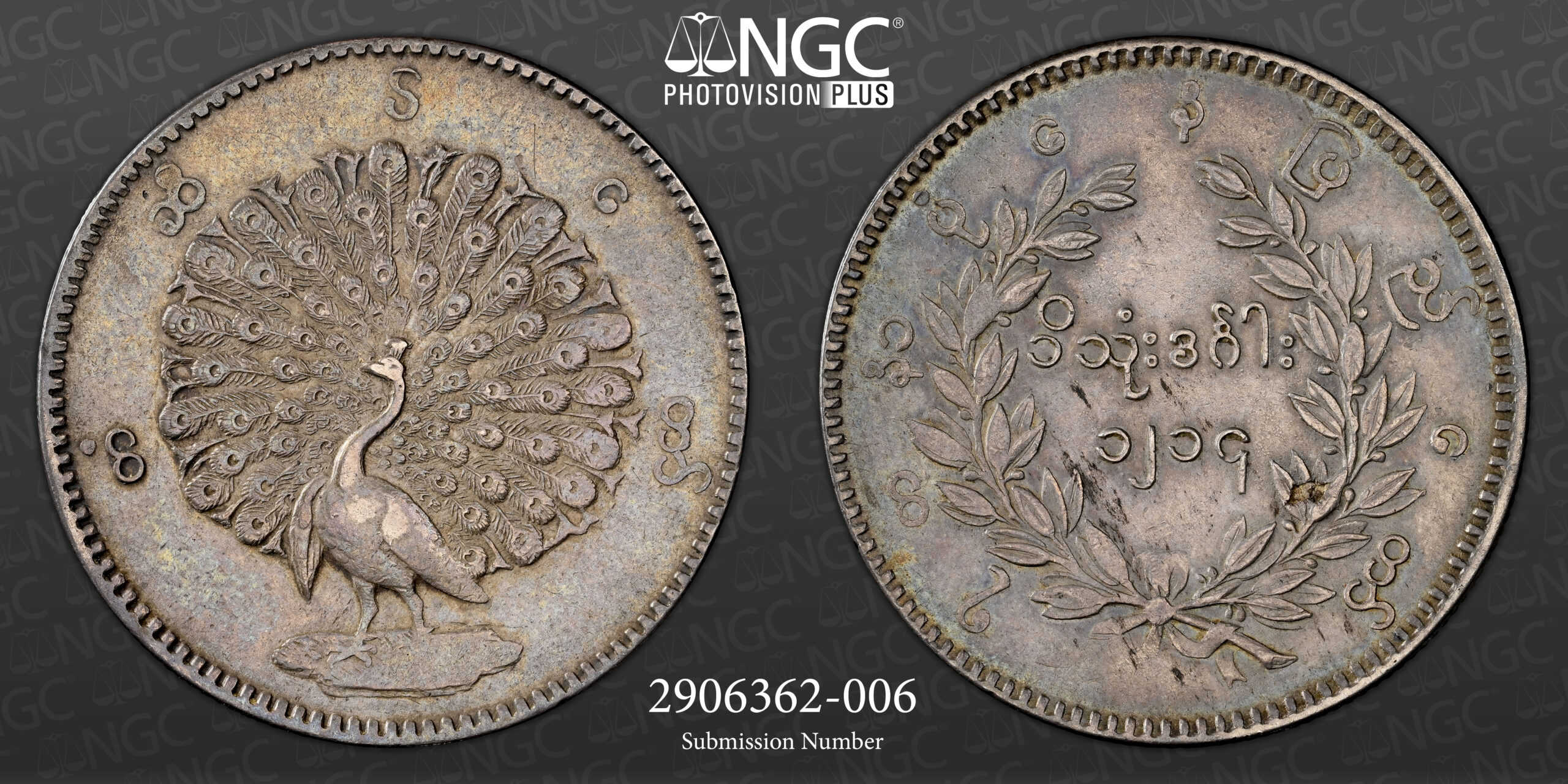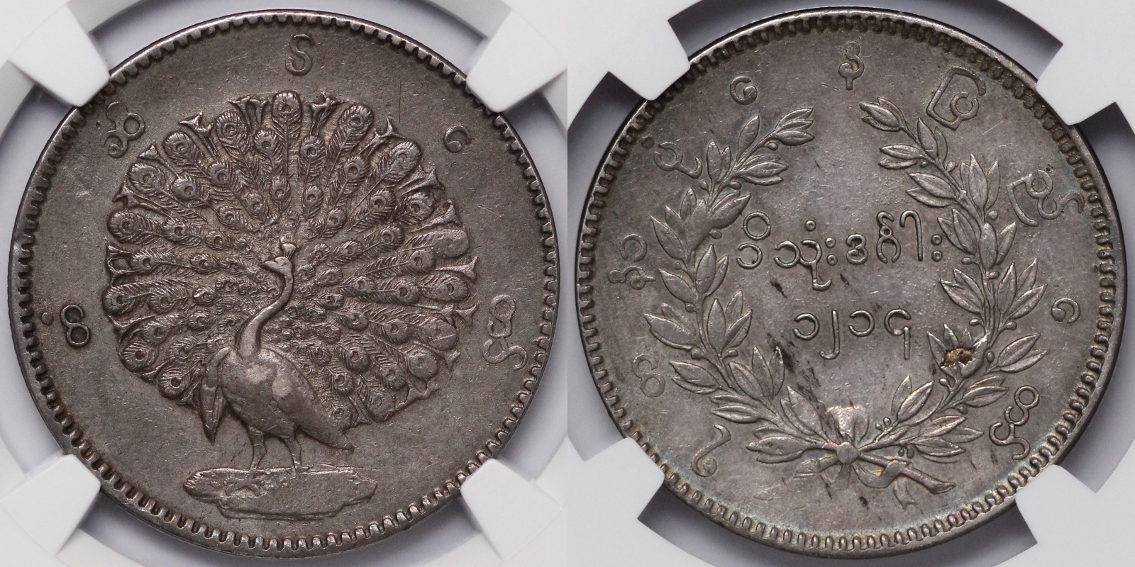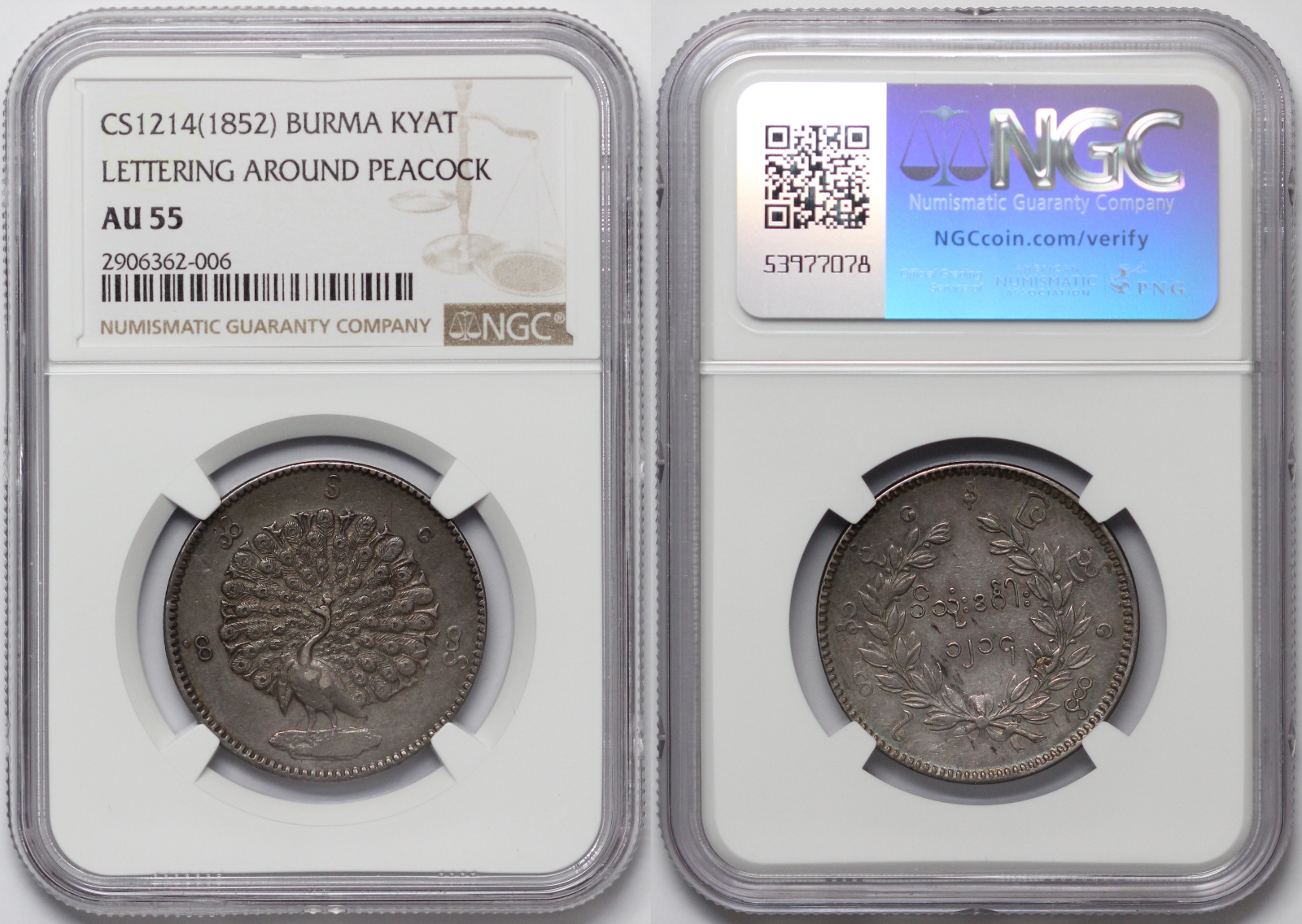 Burma Kyat, CS1214(1852), lettering around peacock. NGC graded AU55.