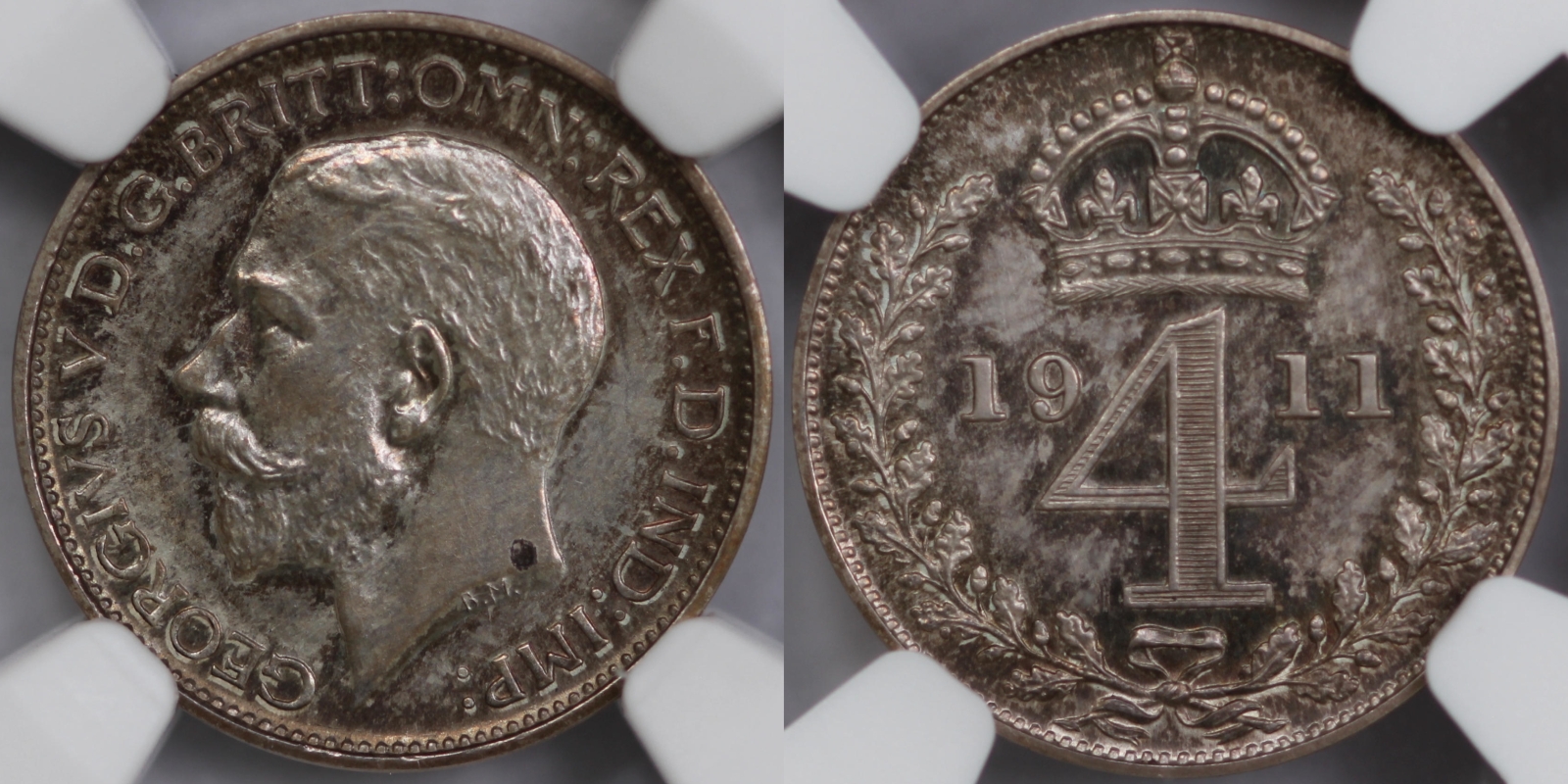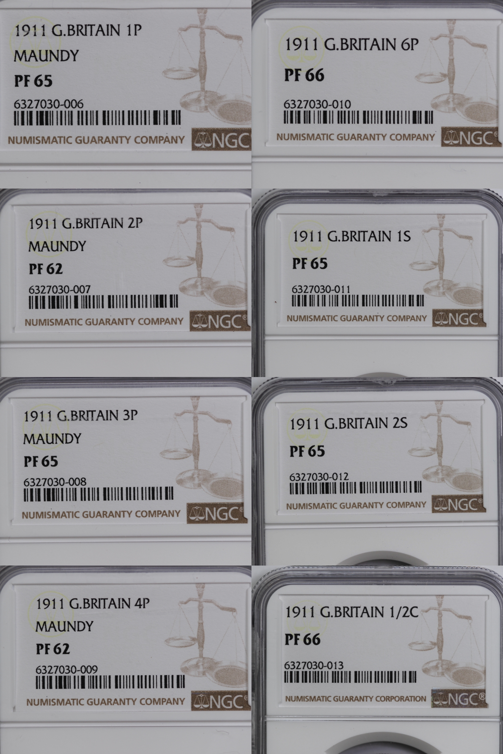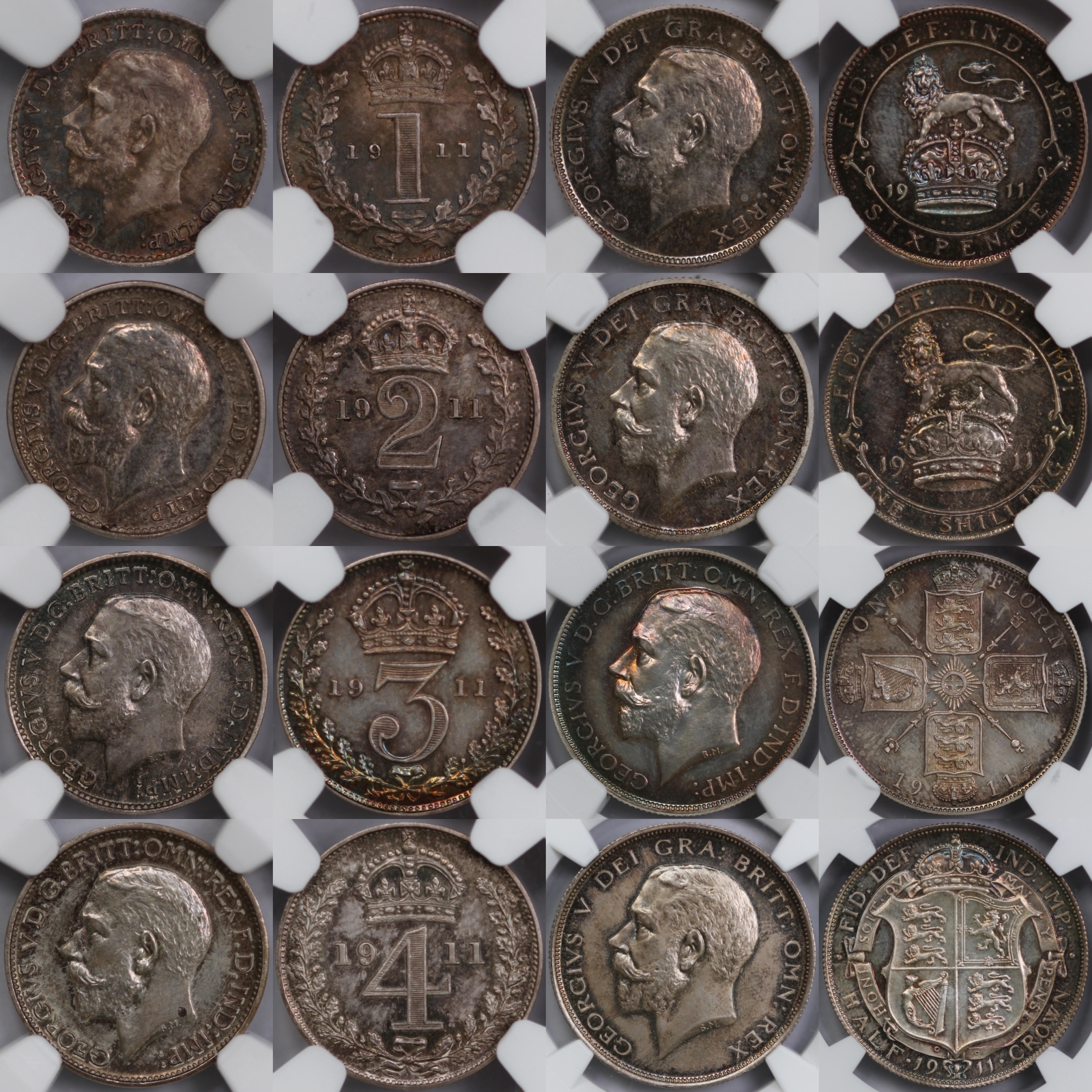 Great Britain 1911 Silver Halfcrown, Florin, Shilling, Sixpence and Maundy Set, NGC grades as follows: