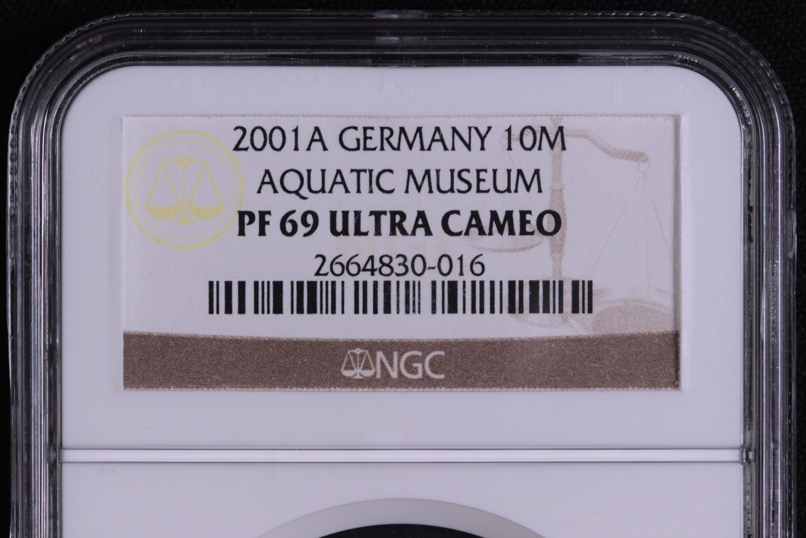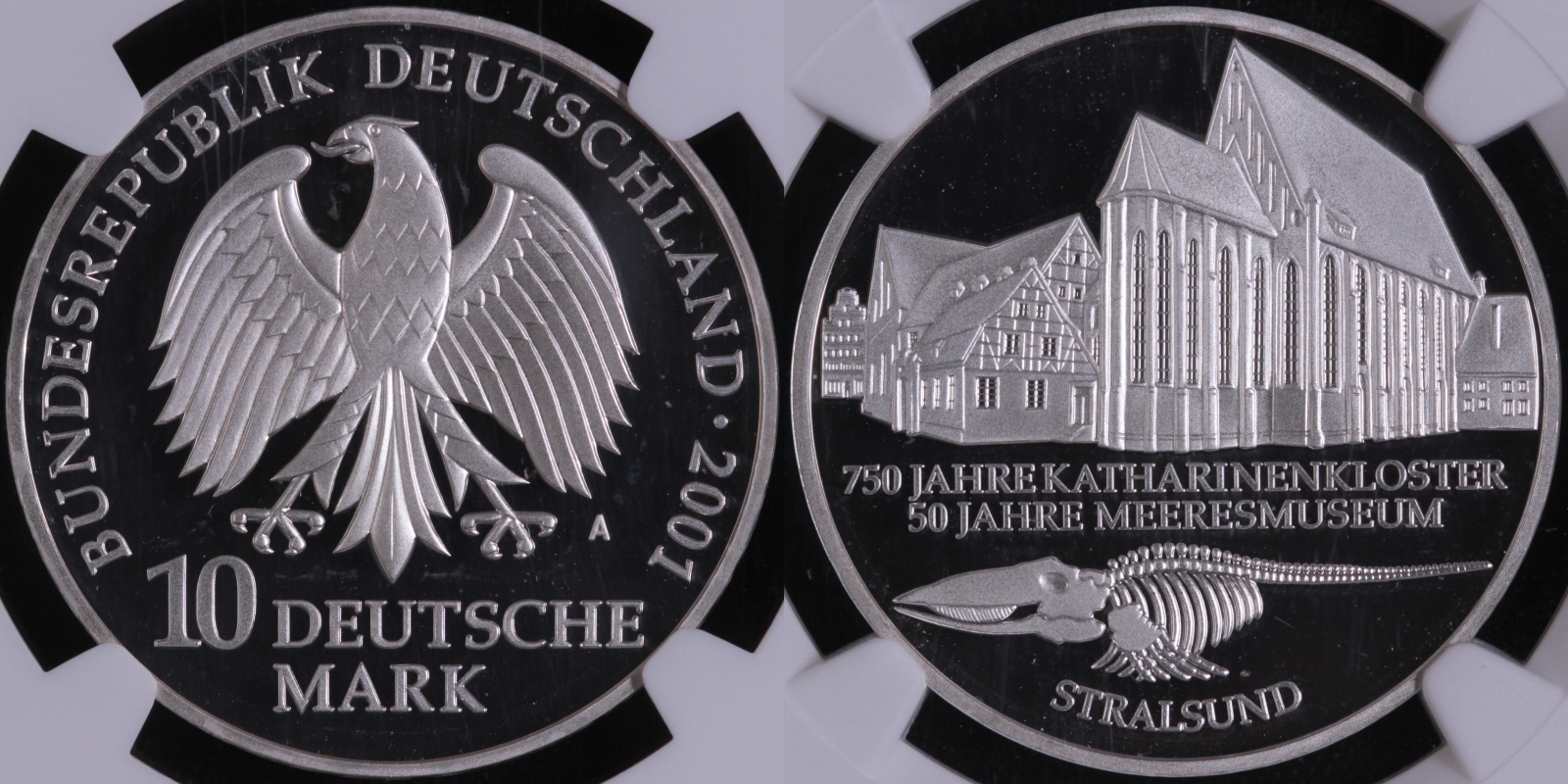 Germany Federal Republic Proof 10 Mark 2001-A. Berlin mint, KM#204. 750 years of St. Catherine’s Monastery & 50 years of the Stralsund Museum. NGC graded PF69 Proof Ultra Cameo – finest graded, top pop.
