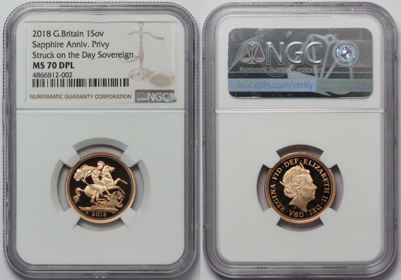 Sapphire Coronation 2018 Strike on the Day Celebration Sovereign. NGC graded MS70DPL. Comes with Royal Mint case, CoA and outer sleeve.